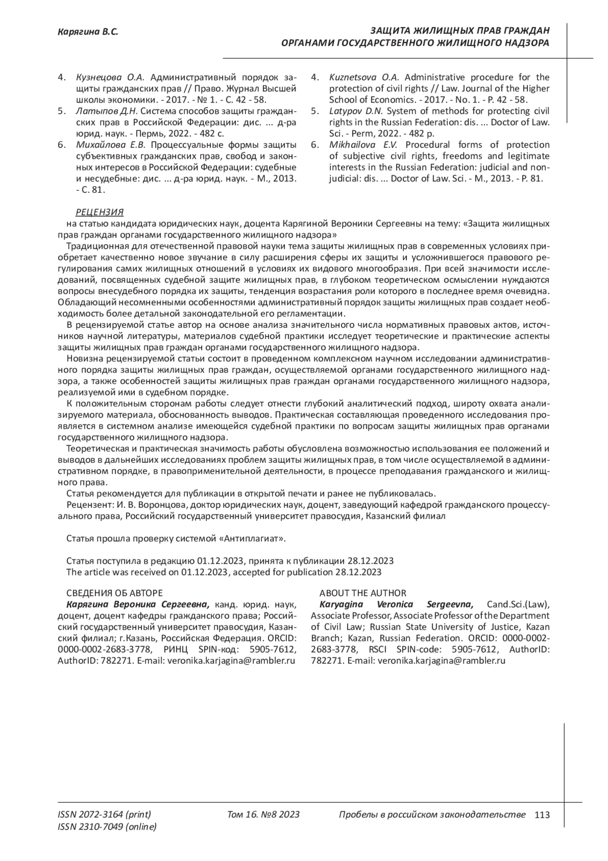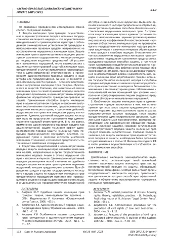 4. 	Кузнецова О.А. Административный порядок защиты гражданских прав // Право. Журнал Высшей школы экономики. - 2017. - № 1. - С. 42 - 58. EDN: VVUAWO