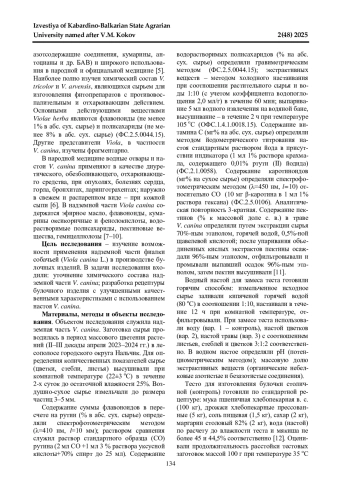 Современным трендом повышения пищевой ценности хлебобулочных изделий является использование в качестве дополнительных рецептурных компонентов растительных биологически активных веществ. Целью исследований стала оценка возможности применения надземной части фиалки собачьей ( Viola canina L.) в производстве булочных изделий. В задачи исследования входили уточнение химического состава надземной части, разработка рецептуры булочного изделия (булочка столичная) с улучшенными качественными характеристиками с использованием настоя V. canina. Заготовка сырья проводилась в период массового цветения растений (II-III декады апреля 2023-2024 гг.) в лесополосе городского округа Нальчик. По данным химического анализа в составе экстрактивных веществ травы содержатся водорастворимые полисахариды (10,61%), пектиновые вещества (1,66%), флавоноиды (1,65%), витамин С (109,71 мг%), каротиноиды (6,4 мг%). При замене воды для замеса теста настоем цветков V. canina отмечается понижение относительной пластичности и повышение относительной упругости, улучшение вкуса и запаха готовых изделий, увеличение продолжительности расстойки теста на 5 мин по сравнению с контролем. Замена воды настоем травы V. canina способствует улучшению реологических свойств и органолептических показателей булочки столичной, сокращению продолжительности расстойки теста на 4 мин по сравнению с контролем за счет повышения бродильной активности дрожжевых клеток. Повышение пищевой ценности булочек с настоем травы V. canina обусловлено наличием в их составе пектиновых веществ (0,42 г/100 г продукта), каротиноидов (1,6 мг/100 г), флавоноидов (105 мг/100 г). 100 г булочки столичной с настоем травы V. canina удовлетворяет физиологическую потребность взрослого человека на 2,1; 13,3 и 32,6% соответственно. Полученные результаты представляют практический и научный интерес в аспекте расширения применения V. canina в производстве хлебобулочных изделий функционального назначения.