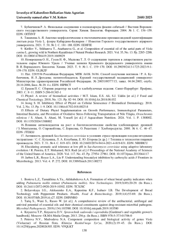 17. 	Активность дрожжей Saccharomyces cerevisiae в условиях стресс-провокации плодово-ягодными экстрактами / С. С. Кузьмина, Л. А. Козубаева, Е. Ю. Егорова [и др.] // Техника и технология пищевых производств. 2021. Т. 51. № 4. С. 819-831. DOI: 10.21603/2074-9414-2021-4-819-831 EDN: NRHHCU