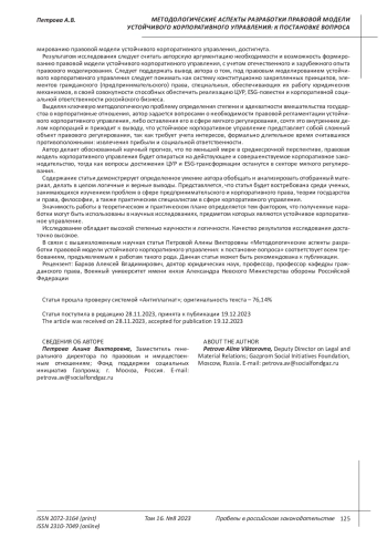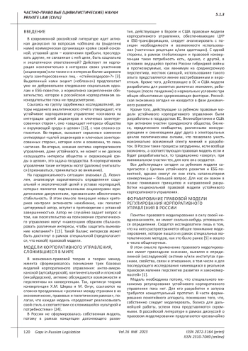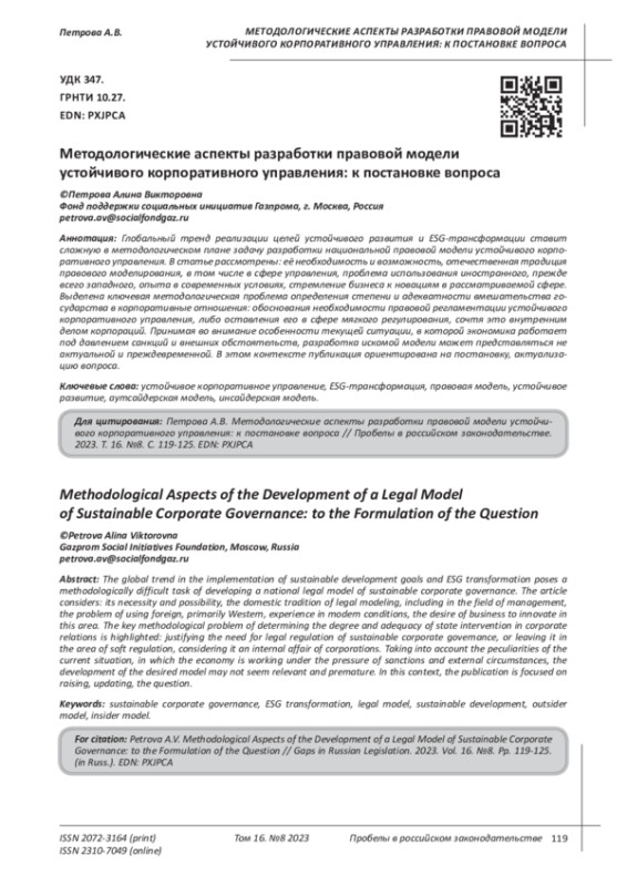 Глобальный тренд реализации целей устойчивого развития и ESG-трансформации ставит сложную в методологическом плане задачу разработки национальной правовой модели устойчивого корпоративного управления. В статье рассмотрены: её необходимость и возможность, отечественная традиция правового моделирования, в том числе в сфере управления, проблема использования иностранного, прежде всего западного, опыта в современных условиях, стремление бизнеса к новациям в рассматриваемой сфере. Выделена ключевая методологическая проблема определения степени и адекватности вмешательства государства в корпоративные отношения: обоснования необходимости правовой регламентации устойчивого корпоративного управления, либо оставления его в сфере мягкого регулирования, сочтя это внутренним делом корпораций. Принимая во внимание особенности текущей ситуации, в которой экономика работает под давлением санкций и внешних обстоятельств, разработка искомой модели может представляться не актуальной и преждевременной. В этом контексте публикация ориентирована на постановку, актуализацию вопроса.