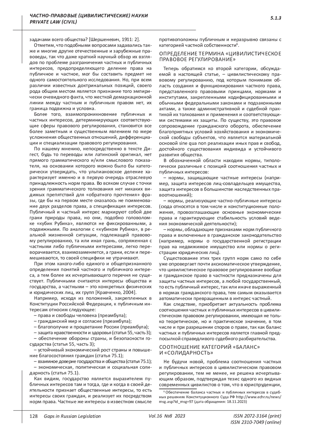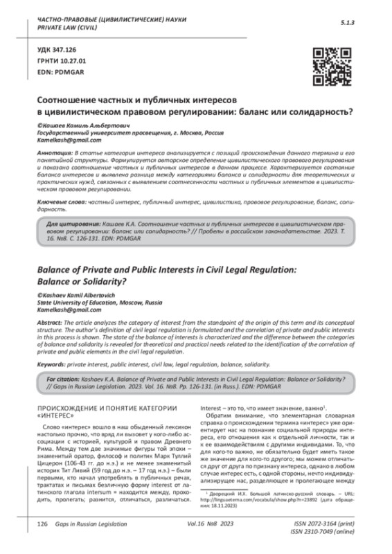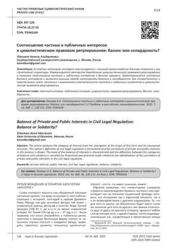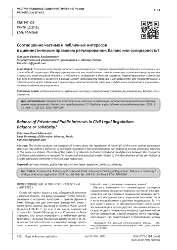 В статье категория интереса анализируется с позиций происхождения данного термина и его понятийной структуры. Формулируется авторское определение цивилистического правового регулирования и показано соотношение частных и публичных интересов в данном процессе. Характеризуется состояние баланса интересов и выявлена разница между категориями баланса и солидарности для теоретических и практических нужд, связанных с выявлением соотнесенности частных и публичных элементов в цивилистическом правовом регулировании.