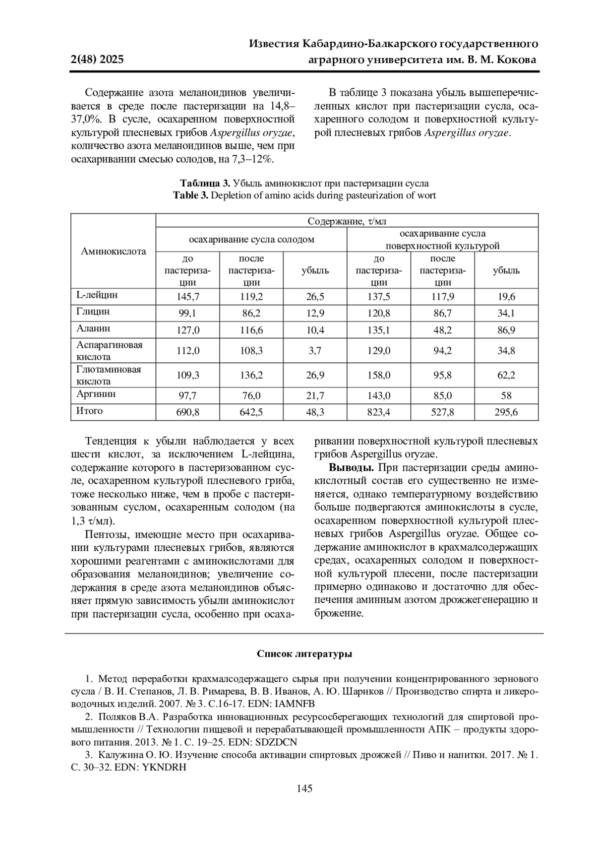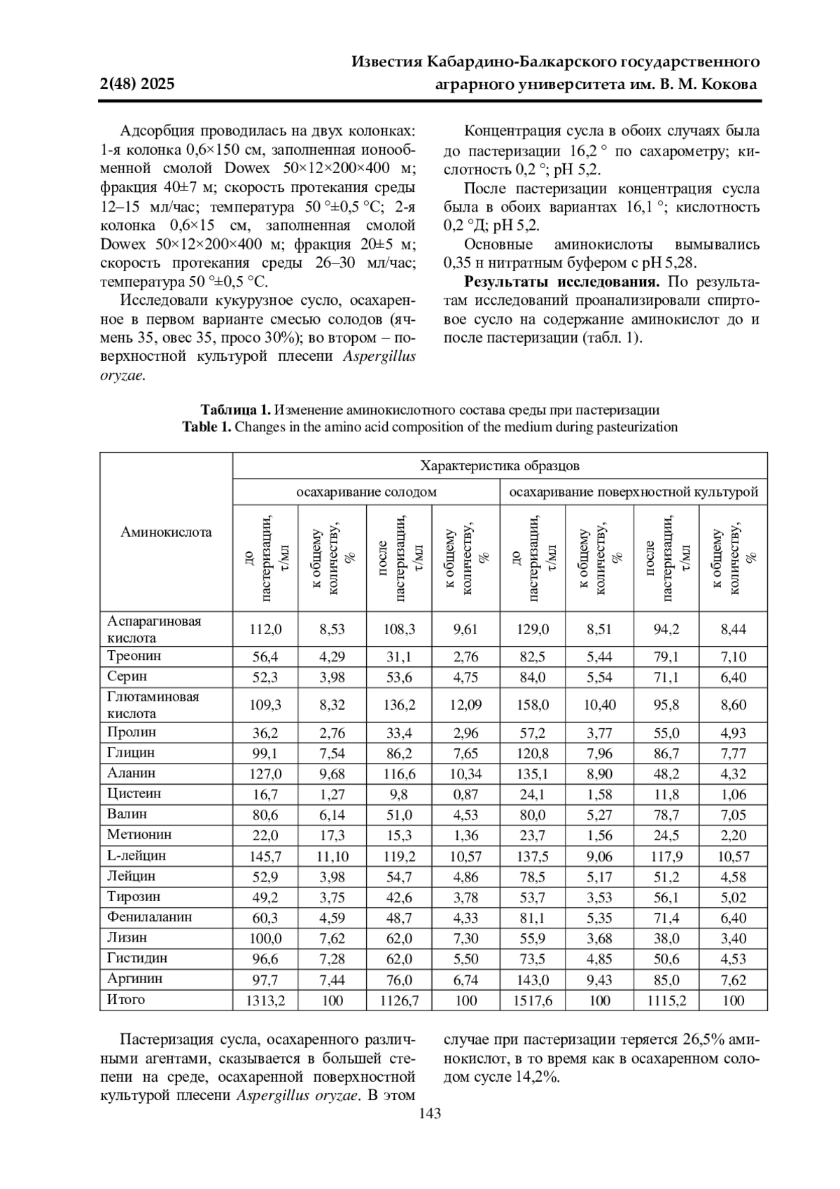 Данная работа посвящена определению изменения аминокислотного состава среды спиртового сусла, осахаренного солодом и поверхностной культурой плесени, до и после пастеризации. Исследования проводились в ООО «Премиум» и на кафедре «Технология производства и переработки сельскохозяйственной продукции» Кабардино-Балкарского ГАУ в 2023-2024 гг. В качестве объектов исследований служили осахаренное сусло до и после пастеризации, бражка, пшеничный солод, культура Aspergillus oryzae. Исследовали кукурузное сусло, осахаренное в первом варианте смесью солодов (ячмень 35, овес 35, просо 30%); во втором - поверхностной культурой плесени Aspergillus oryzae. Установлено, что пастеризация сусла, осахаренного различными агентами, сказывается в большей степени на среде, осахаренной поверхностной культурой плесени Aspergillus oryzae. В этом случае при пастеризации теряется 26,5% аминокислот, в то время как в осахаренном солодом сусле 14,2%. Тенденция к убыли наблюдается у всех шести кислот, за исключением L-лейцина, содержание которого в пастеризованном сусле, осахаренном культурой плесневого гриба, тоже несколько ниже, чем в пробе с пастеризованным суслом. Определено, что при пастеризации среды аминокислотный состав ее существенно не изменяется, однако температурному воздействию больше подвергаются аминокислоты в сусле, осахаренном поверхностной культурой плесневых грибов Aspergillus oryzae. Общее содержание аминокислот в крахмалсодержащих средах, осахаренных солодом и поверхностной культурой плесени, после пастеризации примерно одинаково и достаточно для обеспечения аминным азотом дрожжегенерацию и брожение.