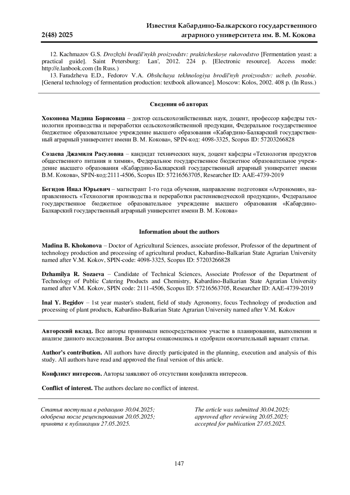 8. Хоконова М. Б., Цагоева О. К. Качественные показатели продуктов брожения в спиртовом производстве // Известия Кабардино-Балкарского государственного аграрного университета им. В. М. Кокова. 2019. № 1(23). С. 56-59. EDN: CJYQIL