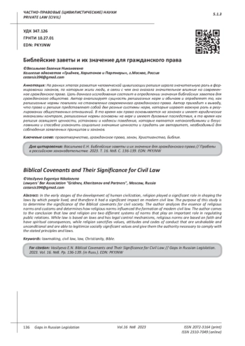 На ранних этапах развития человеческой цивилизации религия играла значительную роль в формировании законов, по которым жили люди, в связи с чем она оказала значительное влияние на современное гражданское право. Цель данного исследования состоит в определении значения библейских заветов для гражданского общества. Автор анализирует сущность религиозных норм и обычаев и определяет то, как религиозные нормы повлияли на становление современного гражданского права. Автор приходит к выводу, что право и религия представляют собой две разные системы норм, которые играют важную роль в регулировании общественных отношений. В то время как право основывается на законах и имеет юридические механизмы контроля, религиозные нормы основаны на вере и имеют духовные последствия, в то время как религия освящает ценности, установки и кодексы поведения, которые являются непоколебимыми и безусловными и способна узаконить социально значимые ценности и придать им авторитет, необходимый для соблюдения заявленных принципов и законов.