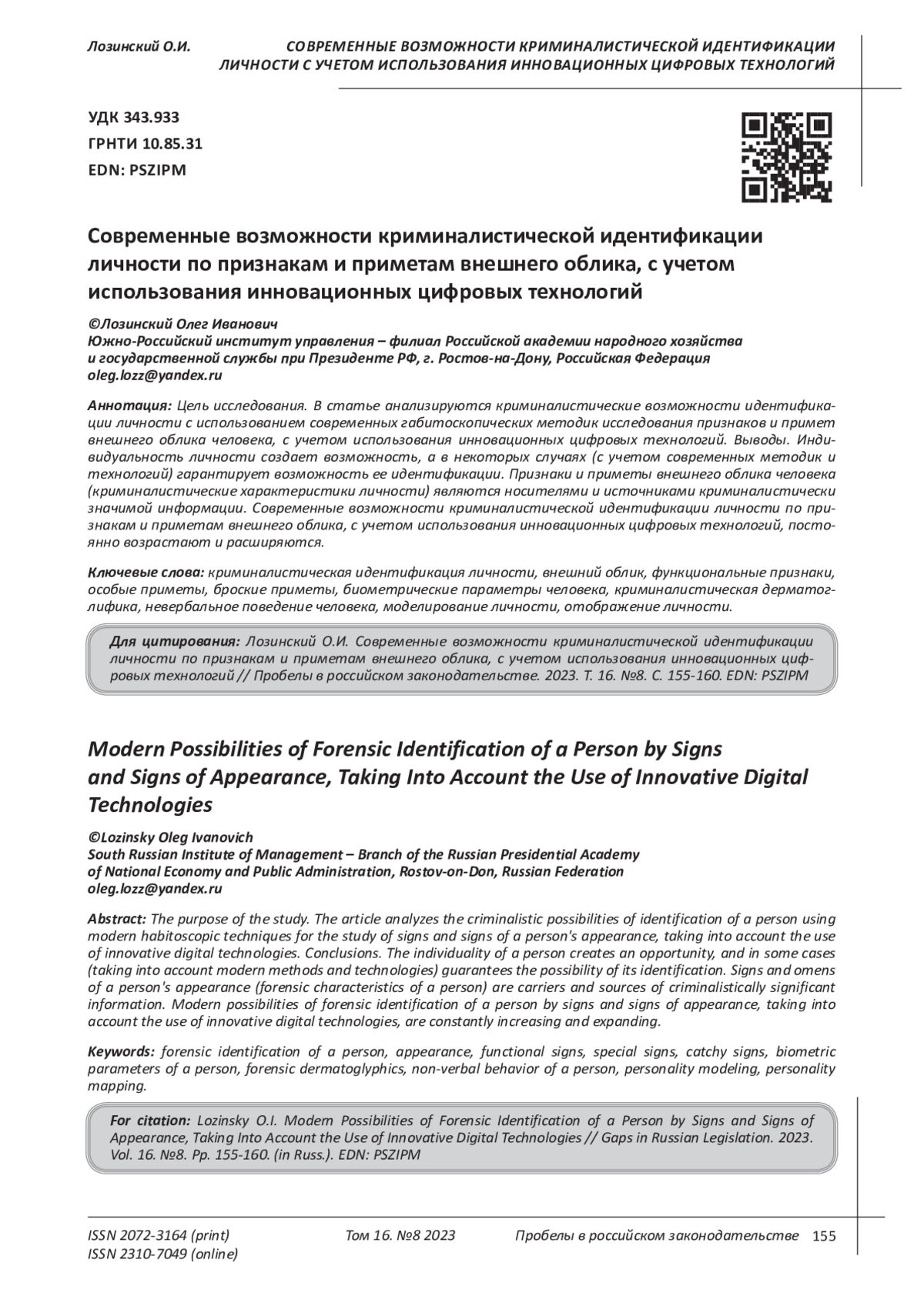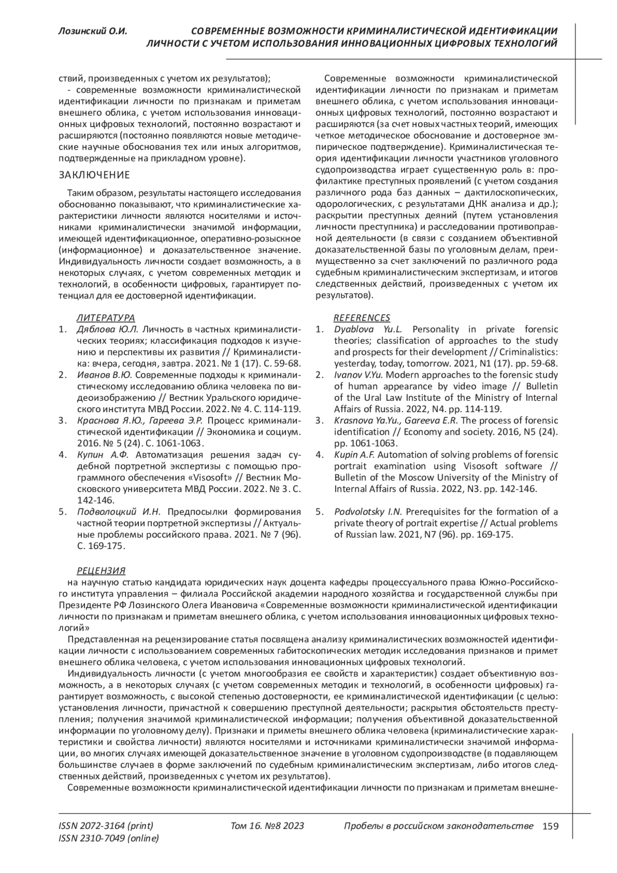 5. 	Подволоцкий И.Н. Предпосылки формирования частной теории портретной экспертизы // Актуальные проблемы российского права. 2021. № 7 (96). С. 169-175.