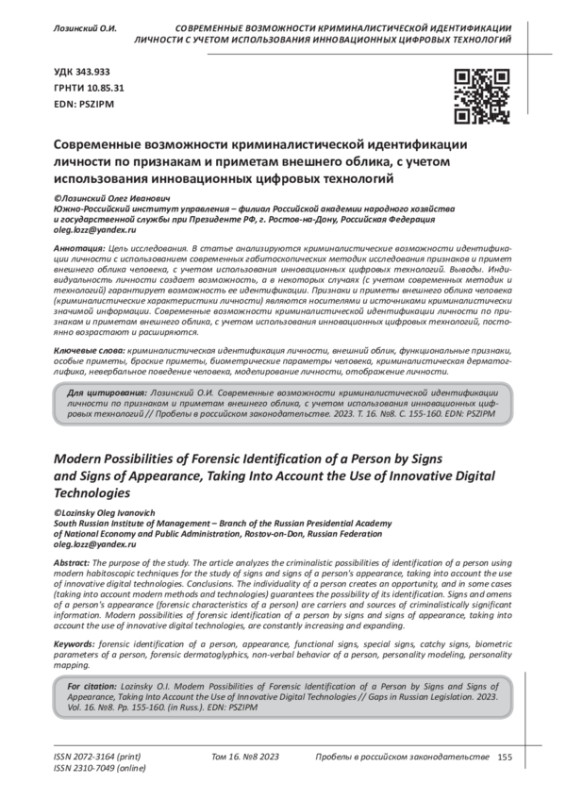Цель исследования. В статье анализируются криминалистические возможности идентификации личности с использованием современных габитоскопических методик исследования признаков и примет внешнего облика человека, с учетом использования инновационных цифровых технологий. Выводы. Индивидуальность личности создает возможность, а в некоторых случаях (с учетом современных методик и технологий) гарантирует возможность ее идентификации. Признаки и приметы внешнего облика человека (криминалистические характеристики личности) являются носителями и источниками криминалистически значимой информации. Современные возможности криминалистической идентификации личности по признакам и приметам внешнего облика, с учетом использования инновационных цифровых технологий, постоянно возрастают и расширяются.