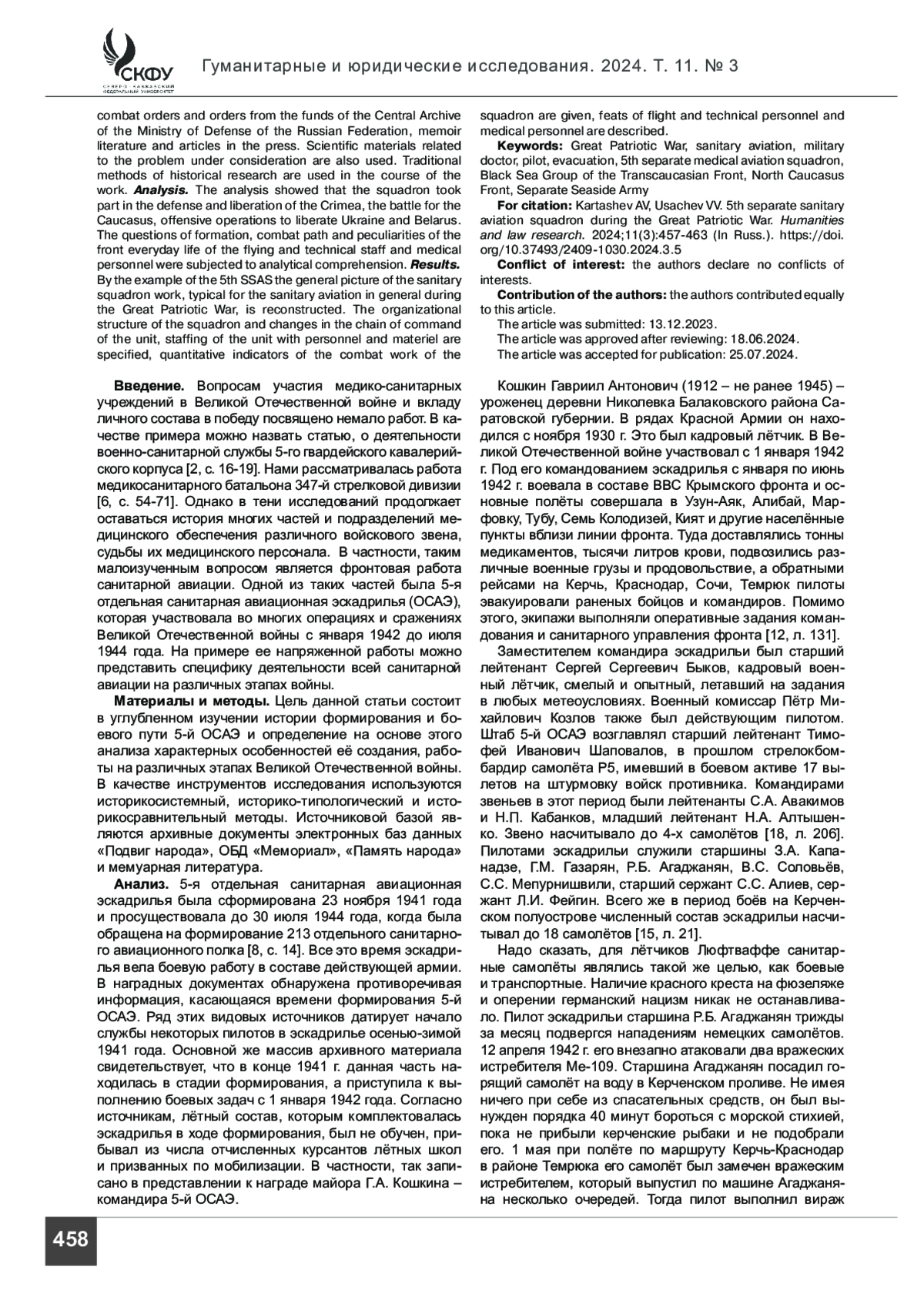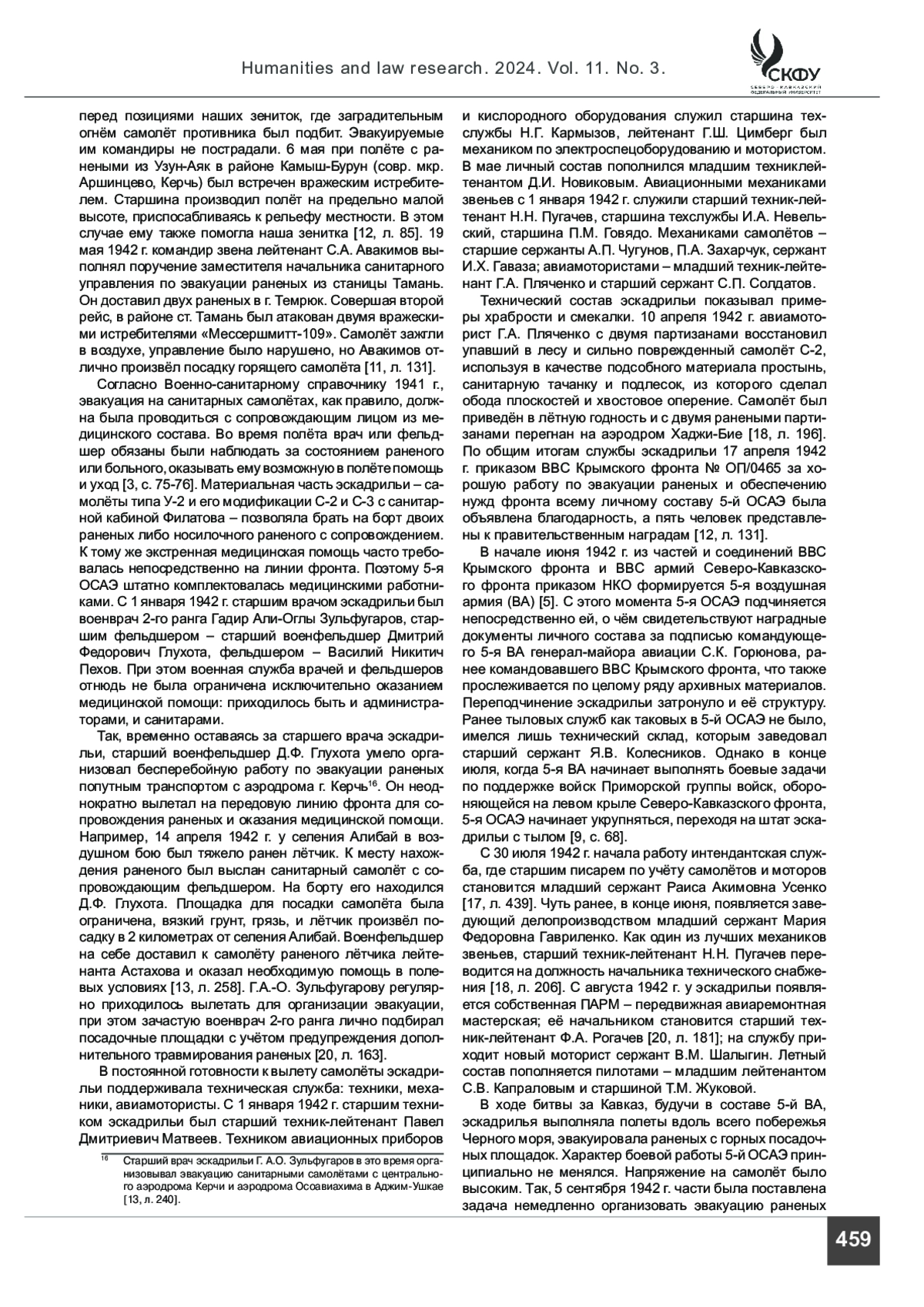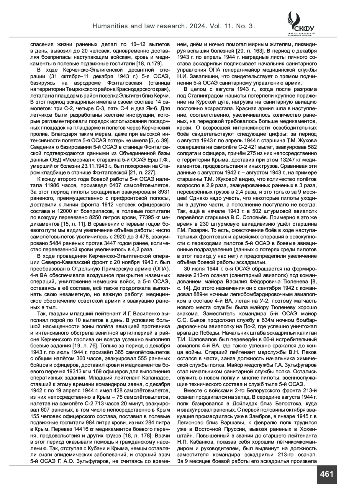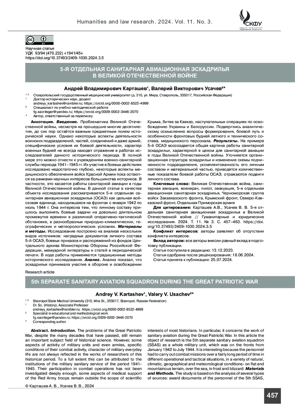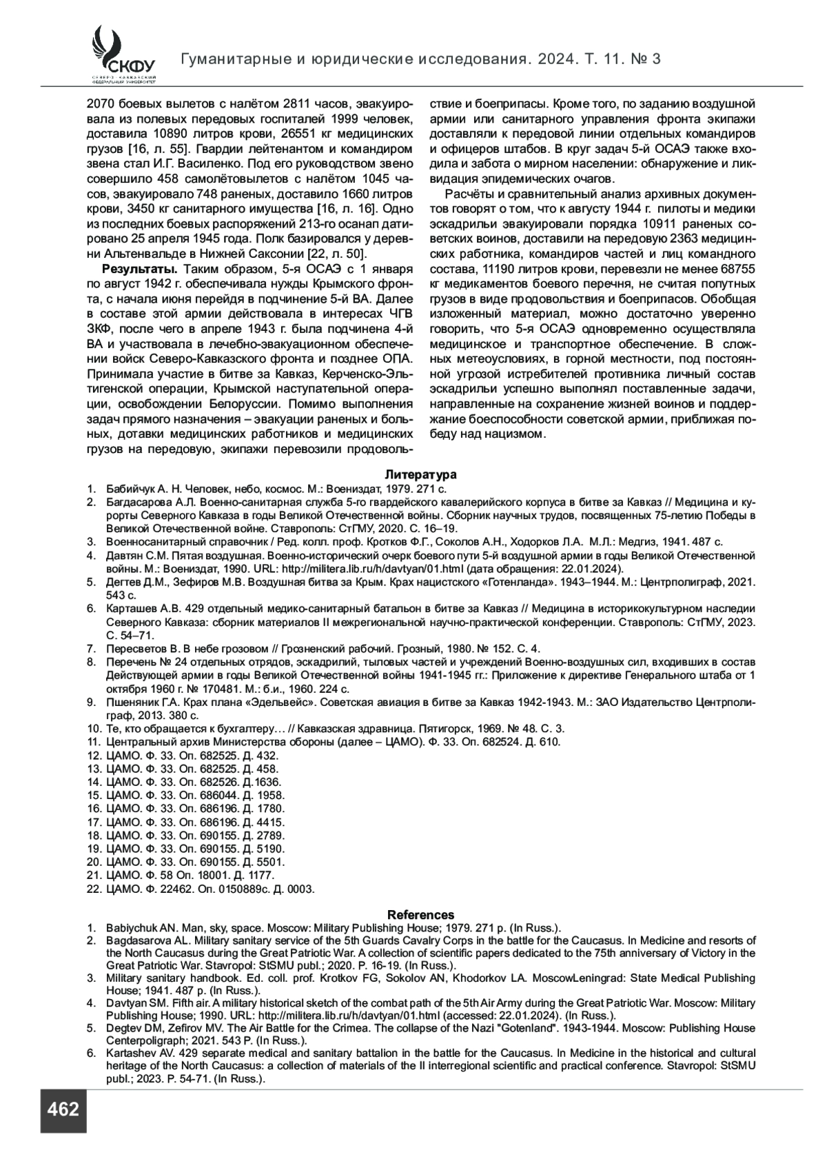 Введение. Проблематика Великой Отечественной войны, несмотря на прошедшие многие десятилетия, до сих пор остаётся важным предметным полем исторической науки. Однако некоторые аспекты деятельности воинских подразделений, частей, соединений и даже армий, специфические условия их боевой деятельности, характер военных будней не всегда находят отражение в работах исследователей данного исторического периода. В полной мере это можно отнести к учреждениям военно-санитарной службы периода 1941–1945 гг. Их участие в боевых действиях исследовано недостаточно глубоко, некоторые аспекты медицинского обеспечения войск Красной Армии пока остаются за рамками научных интересов большинства историков. В частности, это касается работы санитарной авиации в годы Великой Отечественной войны. В данной статье в качестве объекта исследования рассматривается 5-я отдельная санитарная авиационная эскадрилья (ОСАЭ) как цельная войсковая единица, находившаяся на фронтах с января 1942 по июль 1944 г. Она интересна тем, что личному составу пришлось выполнять боевые задачи на довольно длительном промежутке времени в различной оперативно-тактической обстановке, в разнообразных природно-климатических, географических и метеорологических условиях.