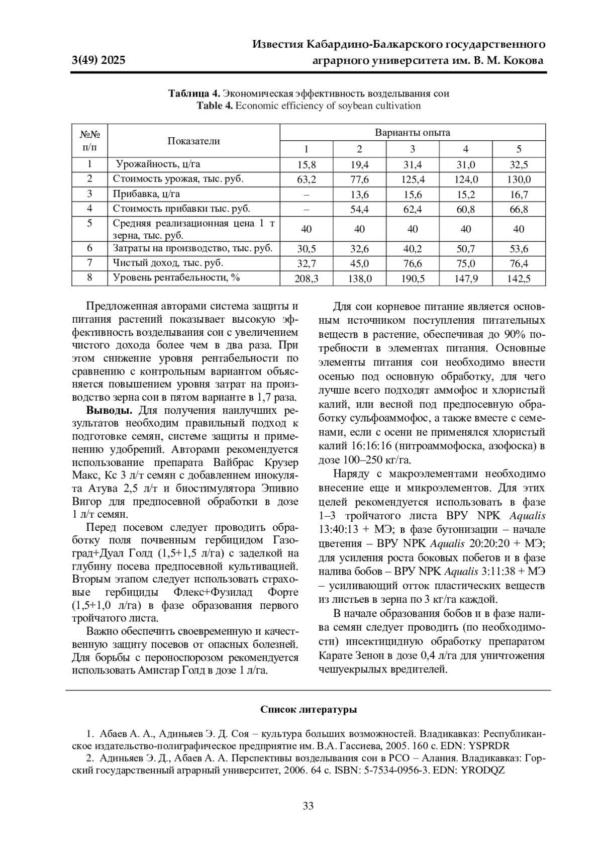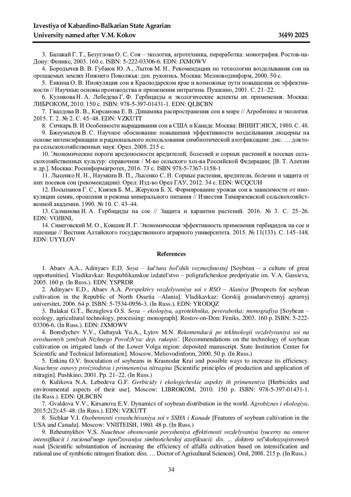 2. Адиньяев Э. Д., Абаев А. А. Перспективы возделывания сои в РСО - Алания. Владикавказ: Горский государственный аграрный университет, 2006. 64 с. ISBN: 5-7534-0956-3 EDN: YRODQZ