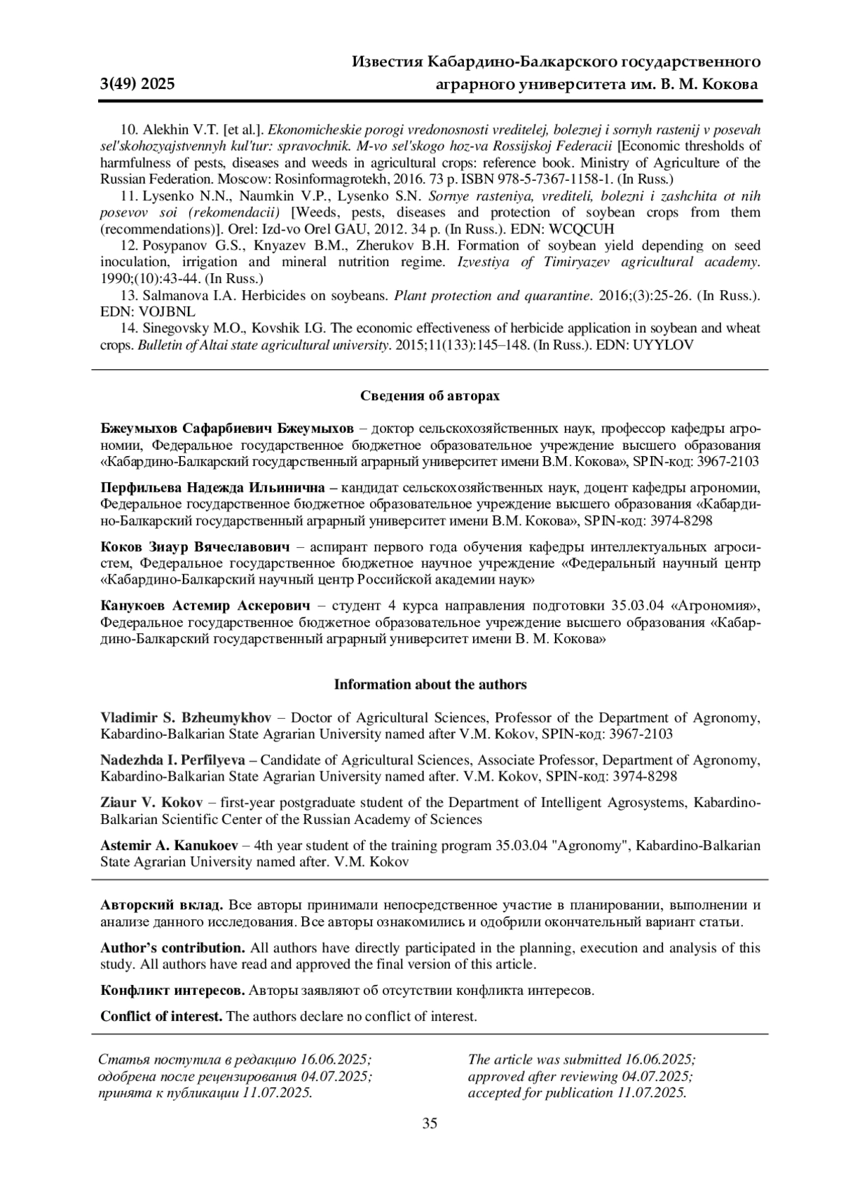 11. Лысенко Н. Н., Наумкин В. П., Лысенко С. Н. Сорные растения, вредители, болезни и защита от них посевов сои (рекомендации). Орел: Изд во Орел ГАУ, 2012. 34 с. EDN: WCQCUH