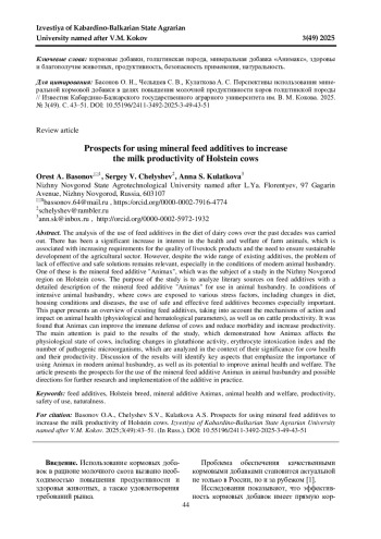 Проведен анализ применения кормовых добавок в рационе дойных коров за последние десятилетия. Отмечен значительный рост интереса к вопросам здоровья и благополучия сельскохозяйственных животных, что связано с увеличением требований к качеству продукции животноводства и необходимостью обеспечения устойчивого развития аграрного сектора. Однако несмотря на широкий ассортимент существующих добавок, проблема недостатка эффективных и безопасных решений остается актуальной, особенно в условиях современного животноводства. Одной из таких является минеральная кормовая добавка «Анимакс», которая была предметом исследования в Нижегородской области на коровах голштинской породы. Цель исследования - анализ литературных источников с детальным описанием минеральной кормовой добавки «Анимакс» для применения в животноводстве. В условиях интенсивного животноводства, где коровы подвержены различным стрессовым факторам, включая изменения в рационе, условия содержания и заболевания, использование безопасных и эффективных кормовых добавок становится особенно важным. В данной работе представлен обзор существующих кормовых добавок с учетом механизмов действия и влияния на здоровье животных (физиологические и гематологические показатели), а также на продуктивность скота. Установлено, что «Анимакс» может способствовать улучшению иммунной защиты, снижению заболеваемости и повышению продуктивности коров. Основное внимание уделено результатам исследования влияния «Анимакс»на физиологическое состояние коров, включая изменения в активности глутатиона, индексе интоксикации эритроцитов и количестве патогенных микроорганизмов, которые проанализированы в контексте их значения для здоровья коров и их продуктивности. Обсуждение результатов позволит выявить ключевые аспекты, которые подчеркивают важность использования «Анимакс» в современном животноводстве, а также его потенциал для улучшения здоровья и благополучия животных. В статье представлены перспективы для дальнейшего исследования и возможные направления применения минеральной кормовой добавки «Анимакс» в животноводстве.