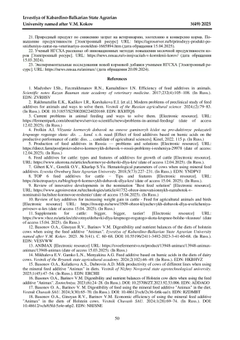 1. 	Мадышев И. Ш., Файзрахманов Р. Н., Камалдинов И. Н. Эффективность кормовых добавок в животноводстве // Ученые записки Казанской государственной академии ветеринарной медицины им. Н. Э. Баумана. 2017. Том 232. № 4. С. 105-108. EDN: ZVRHSV