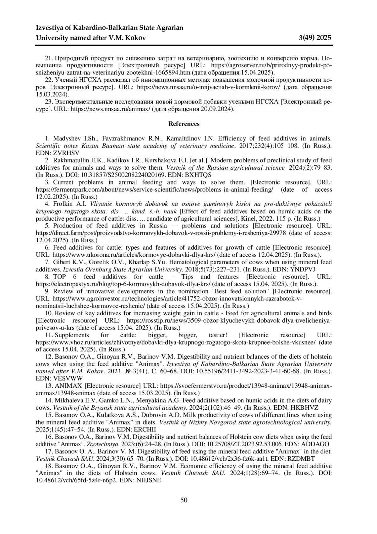 12. 	Басонов О. А., Гиноян Р. В., Баринов В. М. Физиологические, клинические и гематологические показатели коров при использовании в рационах кормления минеральной кормовой добавки “Animax” // Известия Кабардино-Балкарского государственного аграрного университета им. В. М. Кокова. 2023. № 3(41). C. 60-68. DOI: 10.55196/2411-3492-2023-3-41-60-68 EDN: VESVWW