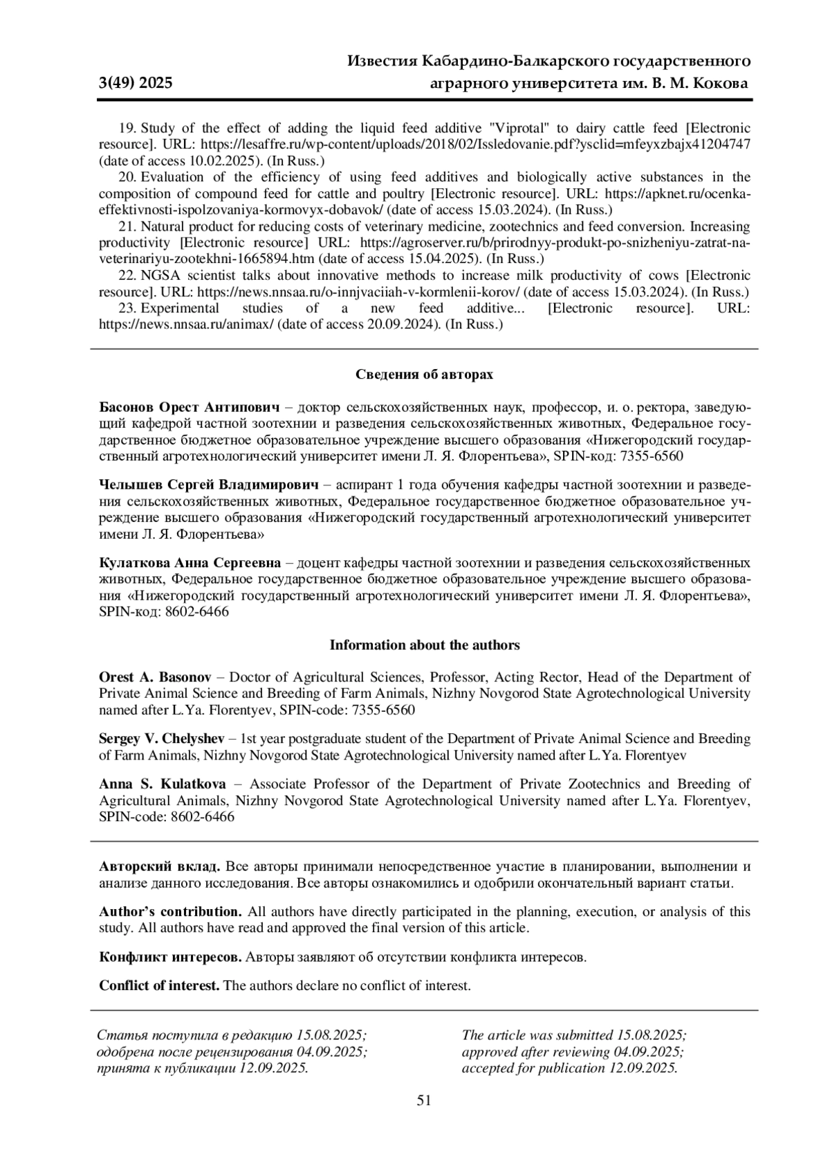 15. 	Басонов О. А., Кулаткова А. С., Дубровин А. Д. Молочная продуктивность коров разных линий при использовании в рационах минеральной кормовой добавки “Animax” // Вестник Нижегородского государственного агротехнологического университета. 2025. № 1(45). С. 47-54. EDN: ERCHII