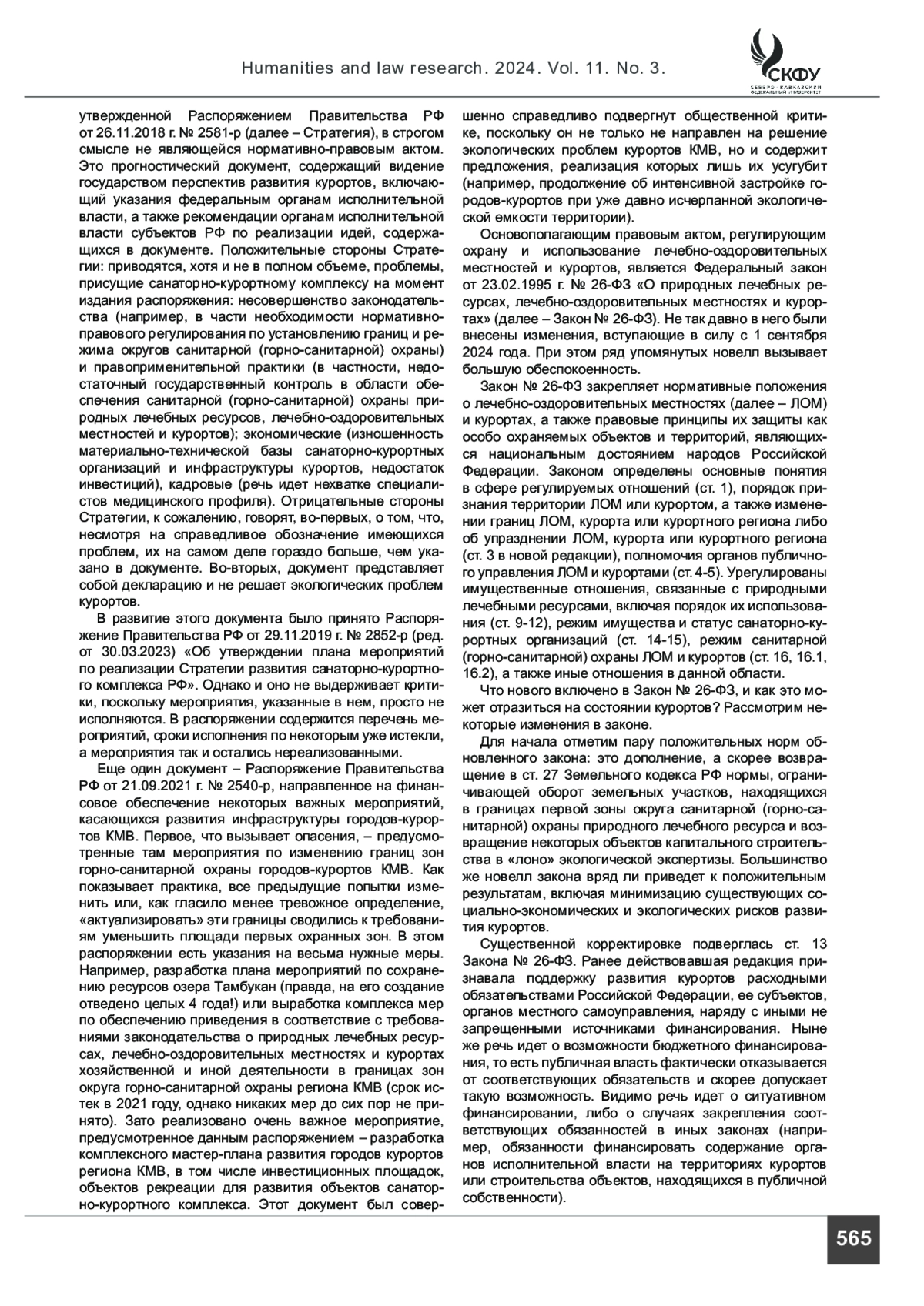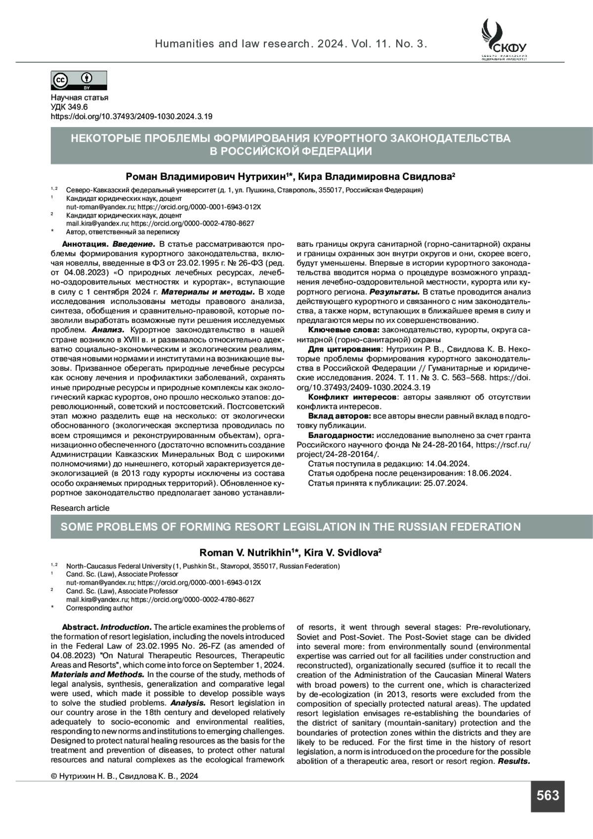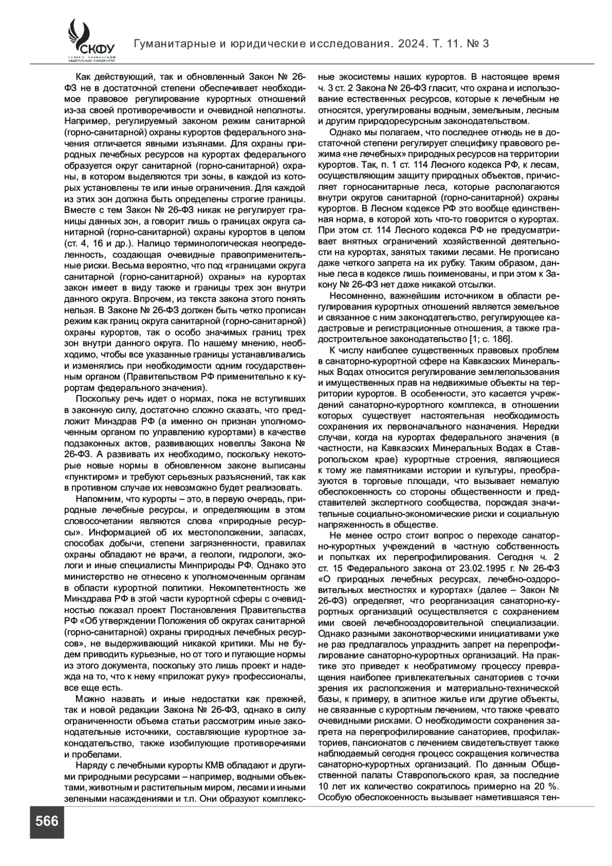 Введение. В статье рассматриваются проблемы формирования курортного законодательства, включая новеллы, введенные в ФЗ от 23.02.1995 г. № 26-ФЗ (ред. от 04.08.2023) «О природных лечебных ресурсах, лечебно-оздоровительных местностях и курортах», вступающие в силу с 1 сентября 2024 г.