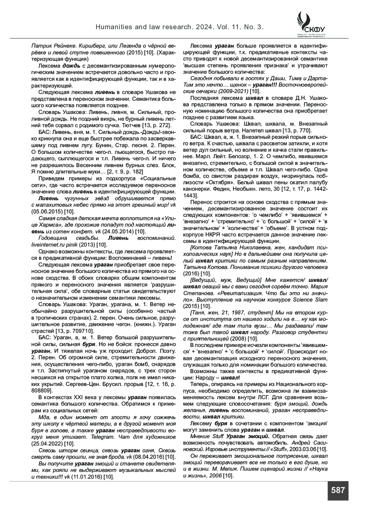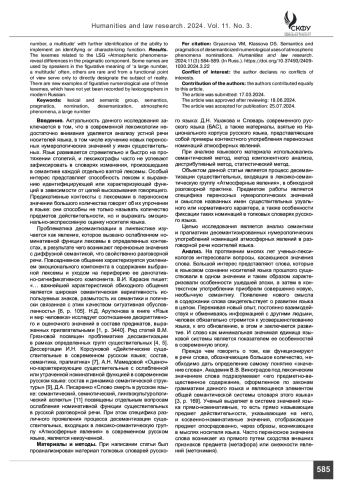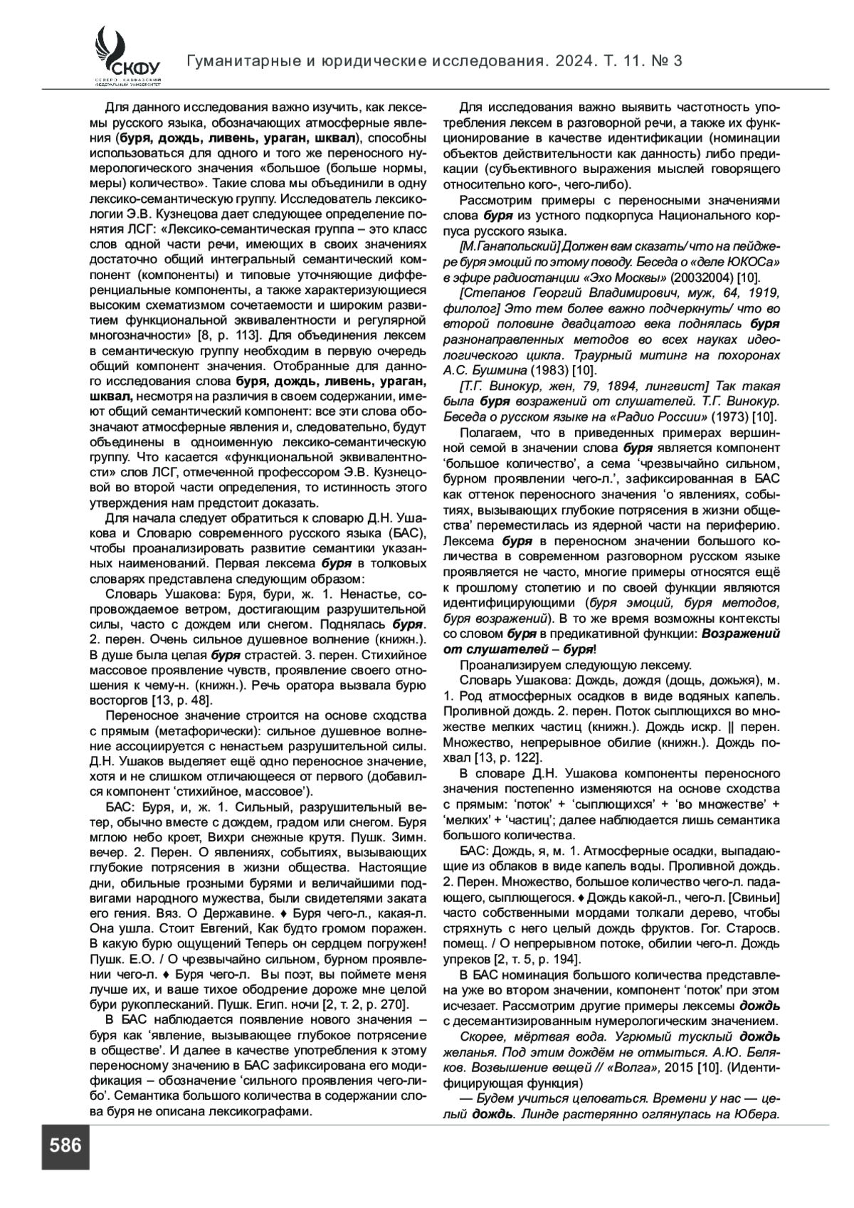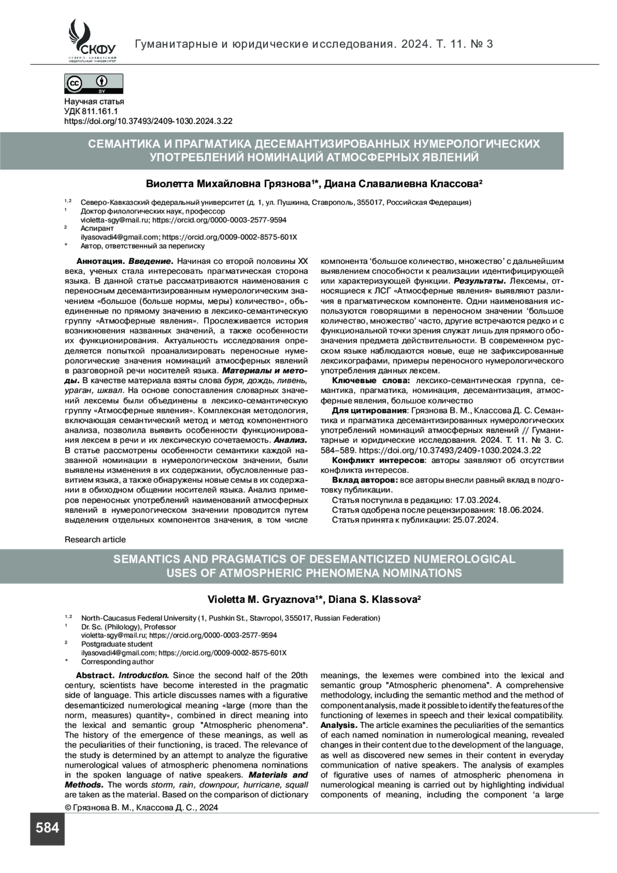 Анализ. В статье рассмотрены особенности семантики каждой названной номинации в нумерологическом значении, были выявлены изменения в их содержании, обусловленные развитием языка, а также обнаружены новые семы в их содержании в обиходном общении носителей языка. Анализ примеров переносных употреблений наименований атмосферных явлений в нумерологическом значении проводится путем выделения отдельных компонентов значения, в том числе компонента ‘большое количество, множество’ с дальнейшим выявлением способности к реализации идентифицирующей или характеризующей функции.