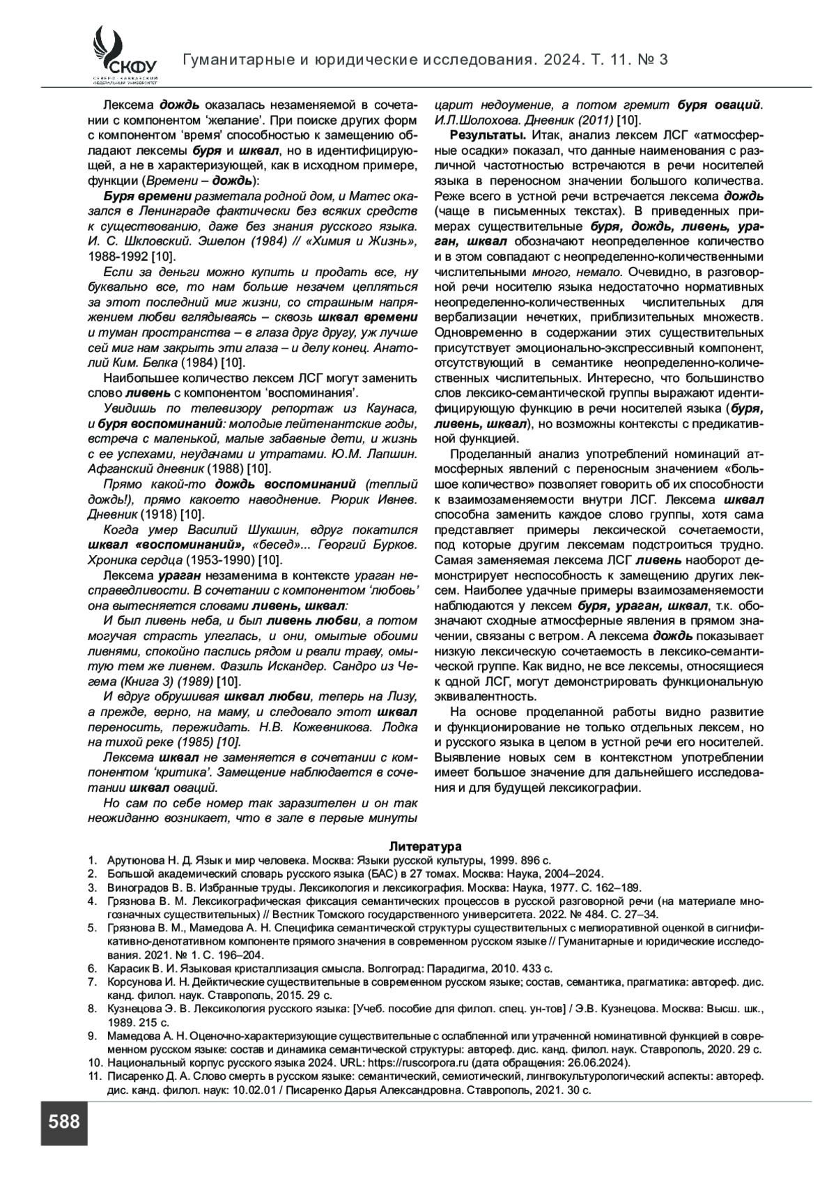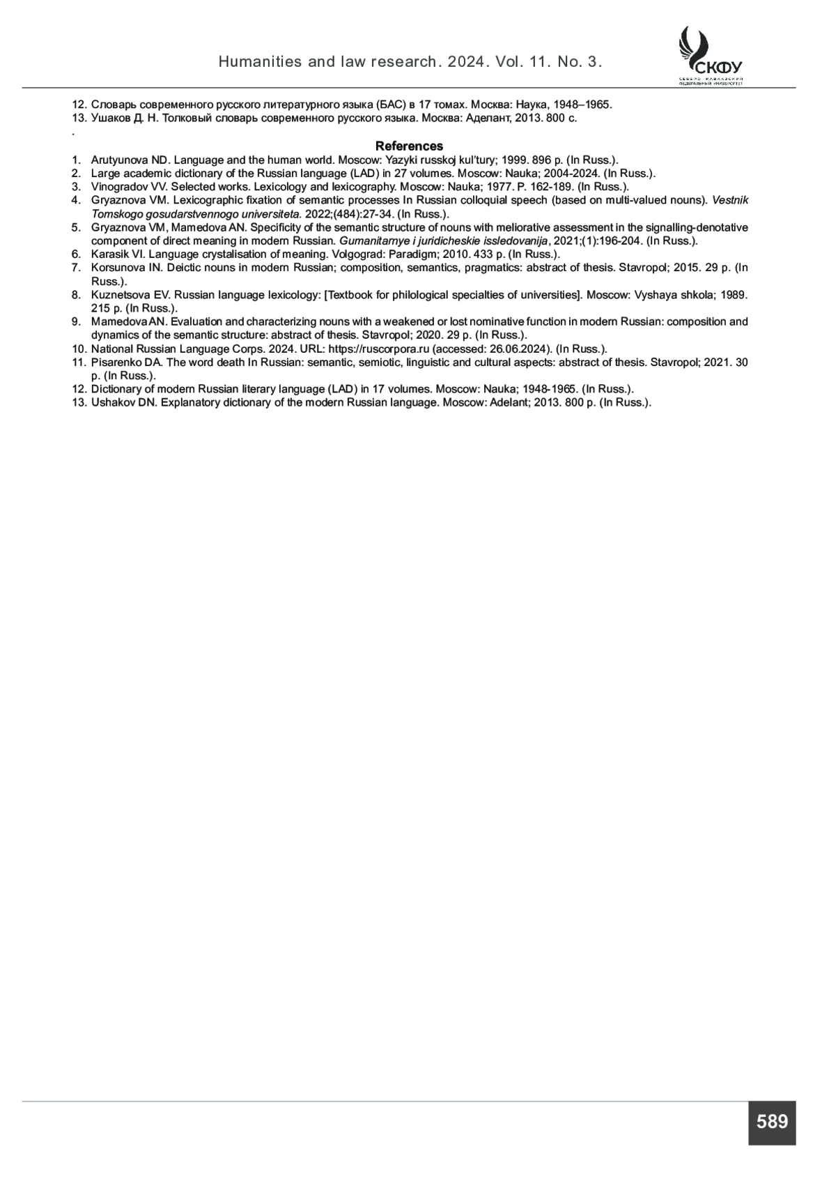 5. Грязнова В. М., Мамедова А. Н. Специфика семантической структуры существительных с мелиоративной оценкой в сигнификативно-денотативном компоненте прямого значения в современном русском языке // Гуманитарные и юридические исследования. 2021. № 1. С. 196-204.
