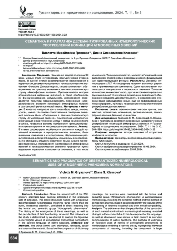 Введение. Начиная со второй половины XX века, ученых стала интересовать прагматическая сторона языка. В данной статье рассматриваются наименования с переносным десемантизированным нумерологическим значением «большое (больше нормы, меры) количество», объединенные по прямому значению в лексико-семантическую группу «Атмосферные явления». Прослеживается история возникновения названных значений, а также особенности их функционирования. Актуальность исследования определяется попыткой проанализировать переносные нумерологические значения номинаций атмосферных явлений в разговорной речи носителей языка.