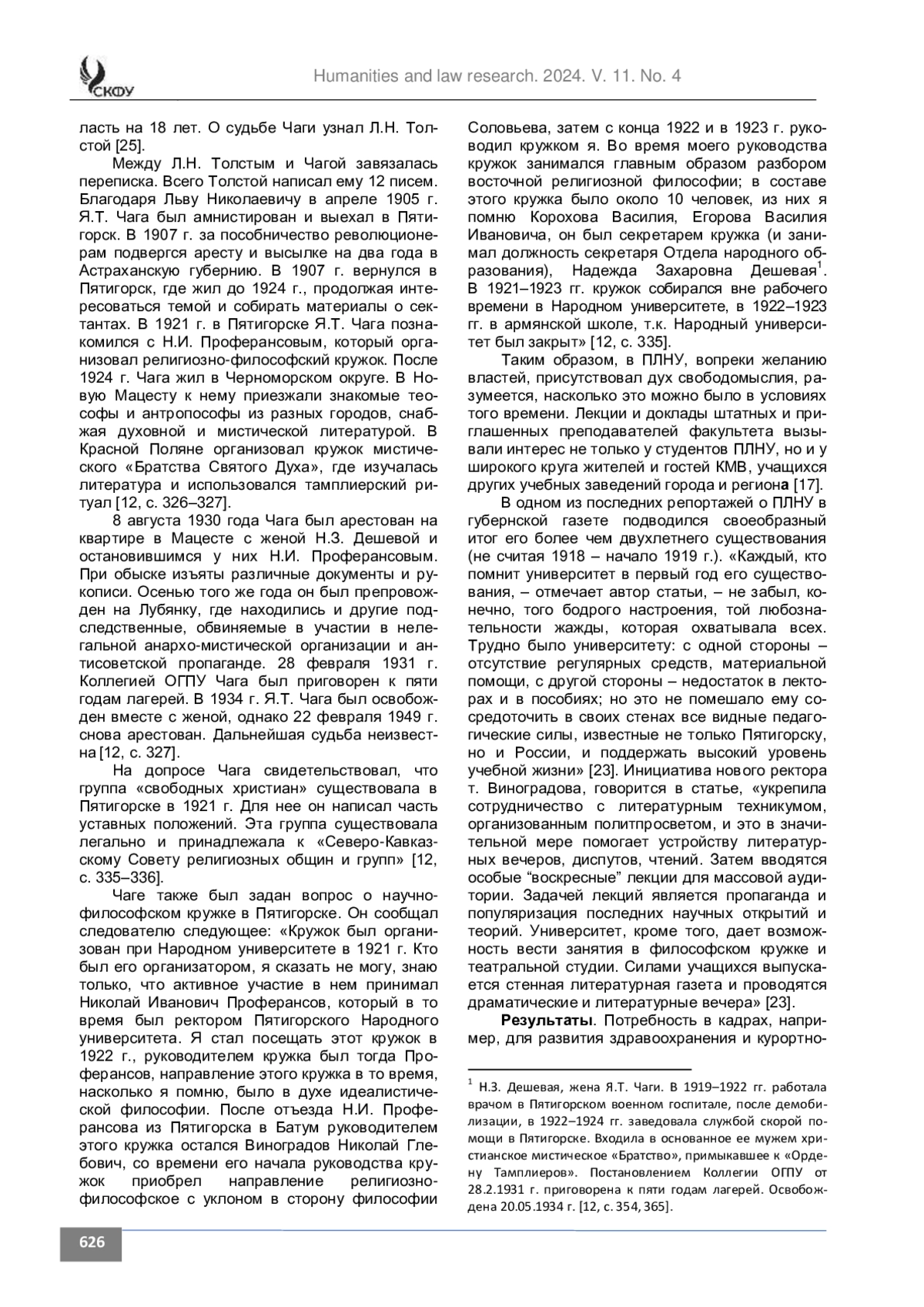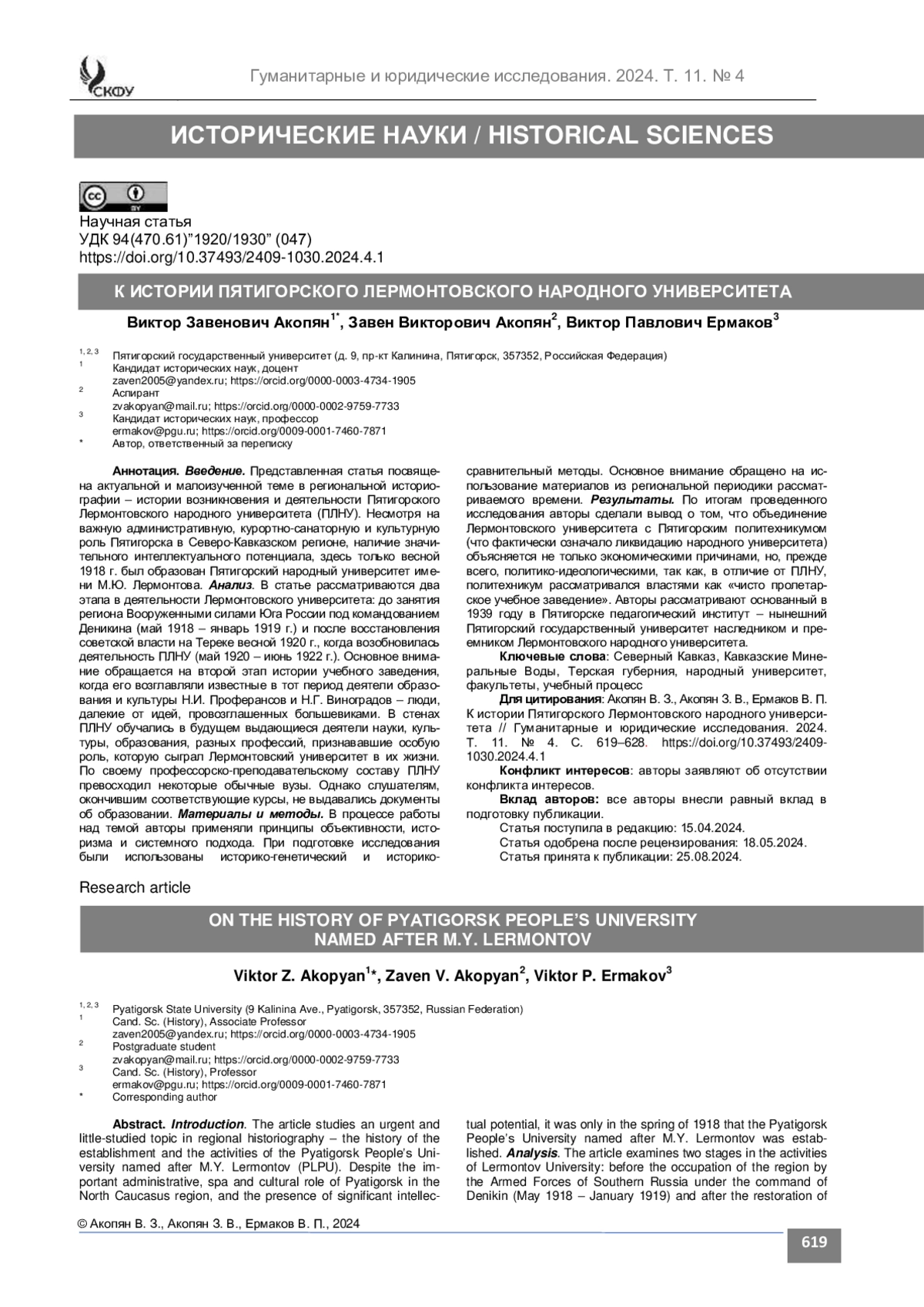 Введение. Представленная статья посвящена актуальной и малоизученной теме в региональной историографии – истории возникновения и деятельности Пятигорского Лермонтовского народного университета (ПЛНУ). Несмотря на важную административную, курортно-санаторную и культурную роль Пятигорска в Северо-Кавказском регионе, наличие значительного интеллектуального потенциала, здесь только весной 1918 г. был образован Пятигорский народный университет имени М. Ю. Лермонтова. Анализ. В статье рассматриваются два этапа в деятельности Лермонтовского университета: до занятия региона Вооруженными силами Юга России под командованием Деникина (май 1918 – январь 1919 г.) и после восстановления советской власти на Тереке весной 1920 г., когда возобновилась деятельность ПЛНУ (май 1920 – июнь 1922 г.). Основное внимание обращается на второй этап истории учебного заведения, когда его возглавляли известные в тот период деятели образования и культуры Н. И. Проферансов и Н. Г. Виноградов – люди, далекие от идей, провозглашенных большевиками. В стенах ПЛНУ обучались в будущем выдающиеся деятели науки, культуры, образования, разных профессий, признававшие особую роль, которую сыграл Лермонтовский университет в их жизни. По своему профессорско-преподавательскому составу ПЛНУ превосходил некоторые обычные вузы. Однако слушателям, окончившим соответствующие курсы, не выдавались документы об образовании.