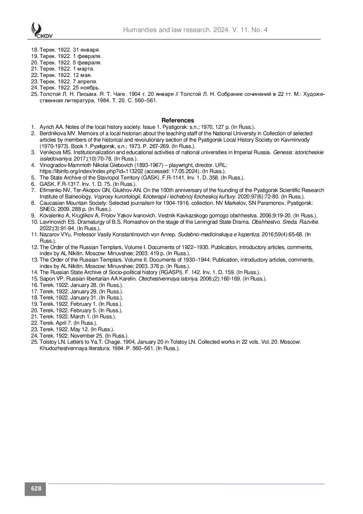 Для цитирования: Кудрявцев А. А., Судавцов Н. Д. Научно-практические мероприятия СКФУ 2023-2024 гг., приуроченные к юбилейным датам со дня подписания международных договоров, как фактор сохранения исторической памяти у учащейся молодежи. Гуманитарные и юридические исследования. 2024;11(4):811-813. https://doi. org/10.37493/2409-1030.2024.4.26