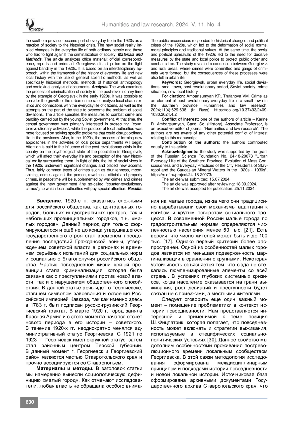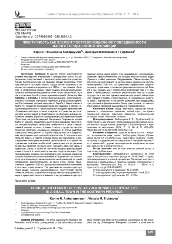 Анализ. В работе исследован процесс криминализации общества в постреволюционный. На примере Георгиевска начала 1920-х гг. удалось рассмотреть рост уровня городской преступности, проанализировать локальные особенности и связь с повседневной жизнью горожан, а также попытки государства по преодолению проблемы социальных девиаций. В статье подробно освещаются мероприятия по борьбе с преступностью и бандитизмом, проводимые молодой советской властью. В это время центральная власть в первую очередь была заинтересована в преследовании «контрреволюционной деятельности», в то время как практика местной власти в большей ориентировалась на решение конкретных проблем, которые могут нарушить обычную жизнь в провинции. Также, в 1920-е гг. начнется процесс формирования новых подходов в деятельности местных отделов милиции. Уделено внимание влиянию постреволюционного кризиса в стране на психологическое состояние населения в Георгиевске, что повлияет на их повседневную жизнь и восприятие окружающей их новой исторической действительности. В свете этого, список общественных пороков в 1920-е гг. претерпел значительные изменения и расставил новые акценты. Так, довольно частые виды преступлений вроде: пьянства, самогоноварения, преступлений против личности, буйства, служебных и имущественных преступлений, в мирное время пополнятся военными преступлениями и преступлениями против новой власти (так называемыми «контрреволюционными преступлениями»), на которые местная власть будет обращать особое внимание.