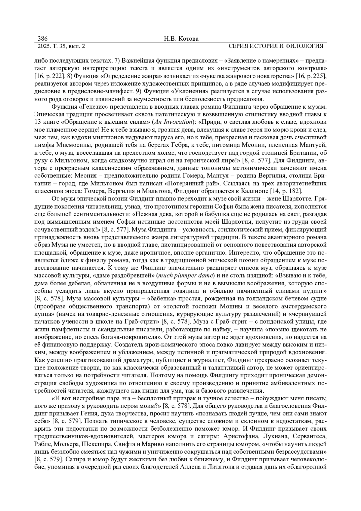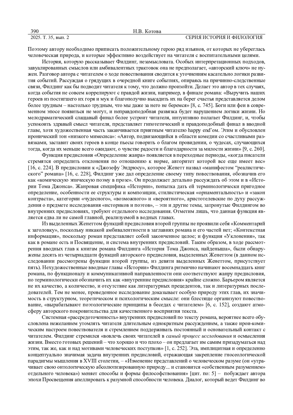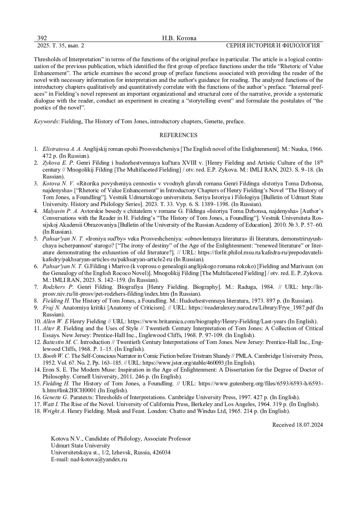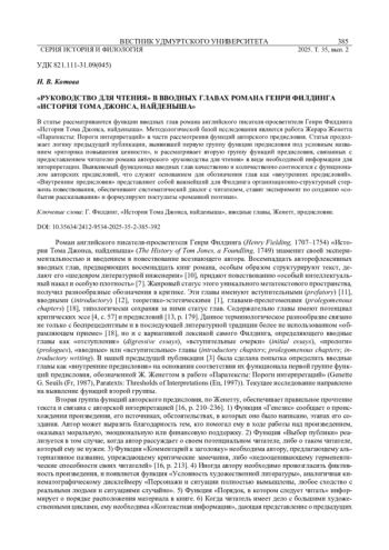 3. Котова Н. В. “Риторика повышения ценности” в вводных главах романа Генри Филдинга “История Тома Джонса, найденыша” // Вестник Удмуртского университета. Серия История и Филология. 2023. Т. 33. Вып. 6. С. 1389-1398. EDN: XXKCNP
