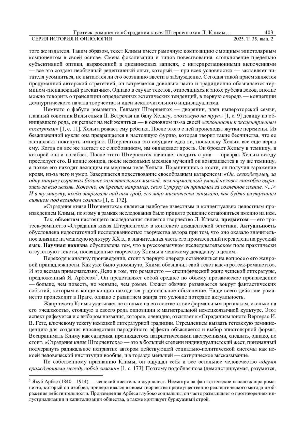 В статье рассматриваются особенности функционирования идейных концепций и тропов, свойственных эстетике декаданса на рубеже XIX-XX вв., в гротеск-романетто Ладислава Климы «Страдания князя Штерненгоха» (Utrpení knížete Sternenhocha, 1928). Указанный текст является репрезентативным для всего творчества Климы, поэтому он и был выбран материалом для проведения настоящего исследования. В романетто посредством различных художественных приемов транслируются типичные для декадентской парадигмы представления: идея индивидуализма выражается в обращении к эпистолярному жанру, идея демиургического начала - посредством смены фокализации и использования приема ненадежного рассказчика, пессимистические настроения эпохи переданы особой авторской иронией. Работая над образом Штерненгоха, Клима деконструирует характерный для декадентских романов архетип наследника знатного рода, находящегося в упадке. Образ Хельги представляет собой сочетание трех наиболее распространенных в эстетике декаданса женских архетипов - женщины-куклы, женщины-хищницы и женщины-ангела - в своеобразной эволюционной последовательности. Наличие в тексте изобразительно-выразительных средств, присущих декадентскому течению, позволяют автору, во-первых, отразить собственную интенциональность, а, во-вторых, обозначить границы интерпретации текста.