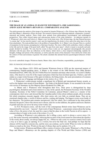 Alice Ann Munro (1931–2024) and Jeanette Winterson (born in 1959) are the renowned masters of contemporary English-speaking prose. A. Munro is the winner of the 2009 Booker Prize (Man Booker International Prize, 2009, UK), the 2013 Noble Prize for Literature and many other awards. As Lester E. Barber states, «She deserves every bit of the respect and praise which has been lavished upon her, I believe, and will endure as a major writer because of the quiet revelations, the biting ironies, the acute presentations of common life and the sure use of language and dialogue in her stories» [6, p. 144].,