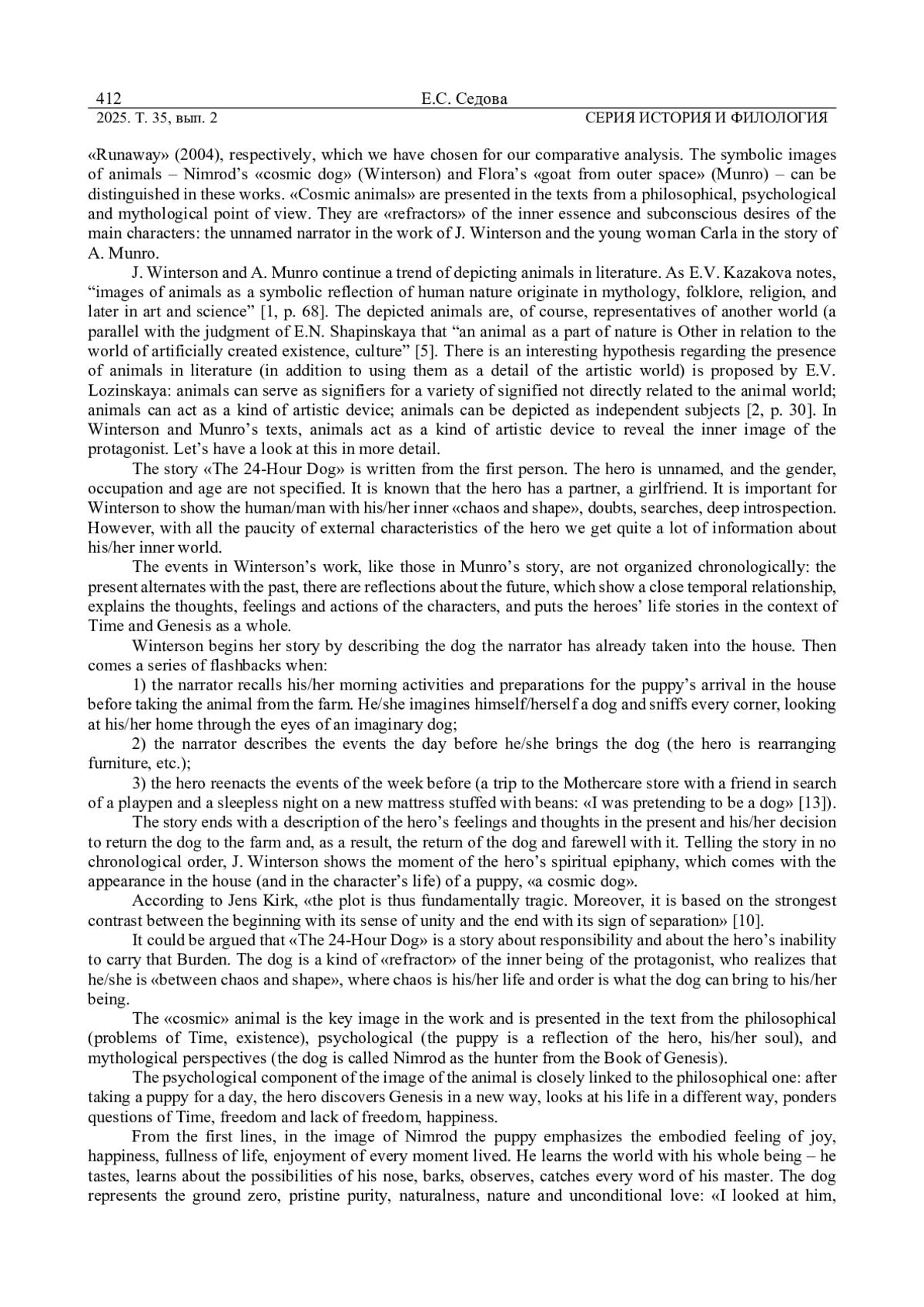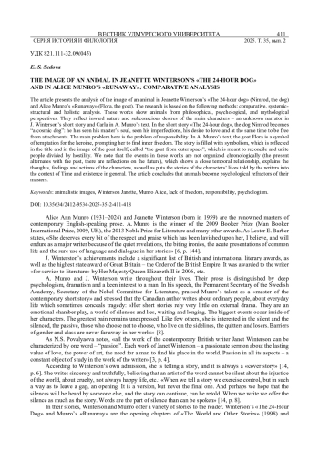 Статья посвящена анализу образа животного в рассказах Дж. Уинтерсон «Щенок на сутки» (собака Нимрод) и Э. Манро «Беглянка» (козочка Флора). Методологической основой для решения исследовательских задач послужили: компаративный, системно-структурный методы, а также метод целостного анализа. В данных произведениях животные показаны с точки зрения философской, психологической и мифологической. Они отражают внутреннюю сущность и подсознательные желания центральных героев - безымянного рассказчика в рассказе Уинтерсон и Карлы в тексте Манро. В рассказе «Щенок на сутки» пес Нимрод становится «a cosmic dog»: он узрел душу своего хозяина, увидел его несовершенства, желание любить и в то же время быть свободным от привязанностей. Главной здесь становится проблема ответственности. В тексте Манро коза Флора является символом искушения для героини, подсказывает ей путь к обретению внутренней свободы. Рассказ наполнен символикой, которая отражена в названии и в образе самой козы, названной «the goat from outer space», которая призвана примирить, объединить разделенных враждебностью людей. Мы отмечаем, что события в данных произведениях выстроены не по хронологии (настоящее чередуется с прошлым, есть размышления о будущем), что показывает тесную временную взаимосвязь, объясняет мысли, чувства и поступки персонажей, а также вписывает рассказываемые писателями истории из жизни героев в контекст Времени и бытия в целом. В статье делается вывод о том, что животные становятся психологическими рефракторами своих хозяев.