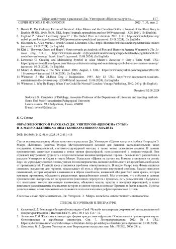 2. 	Лозинская Е. В. Животные в литературе: формы присутствия и функции // Социальные и гуманитарные науки. Отечественная и зарубежная литература. Сер. 7, Литературоведение. 2023. № 3. URL: https://cyberleninka.ru/article/n/zhivotnye-v-literature-formy-prisutstviya-i-funktsii (дата обращения: 13.08.2024).