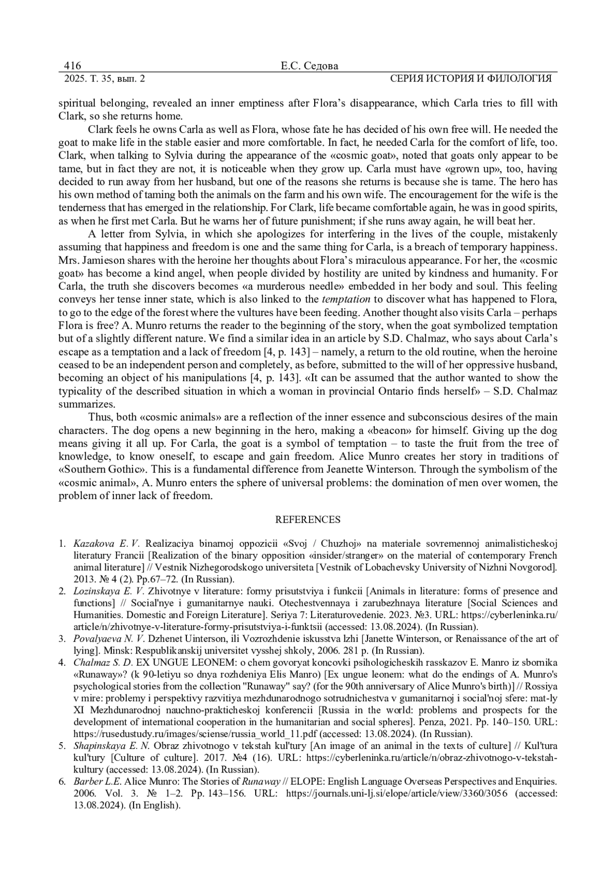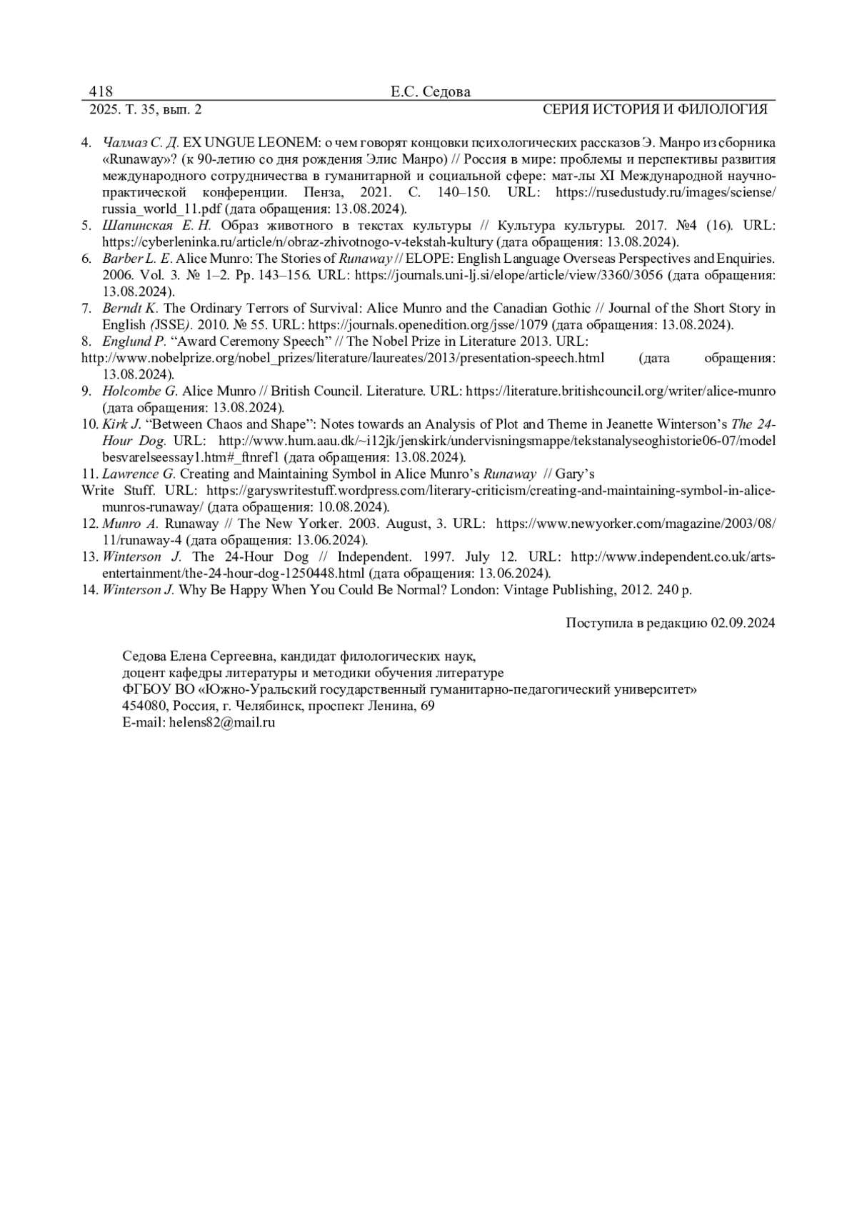 6. 	Barber L. E. Alice Munro: The Stories of Runaway // ELOPE: English Language Overseas Perspectives and Enquiries. 2006. Vol. 3. № 1-2. Pp. 143-156. URL: https://journals.uni-lj.si/elope/article/view/3360/3056 (дата обращения: 13.08.2024).