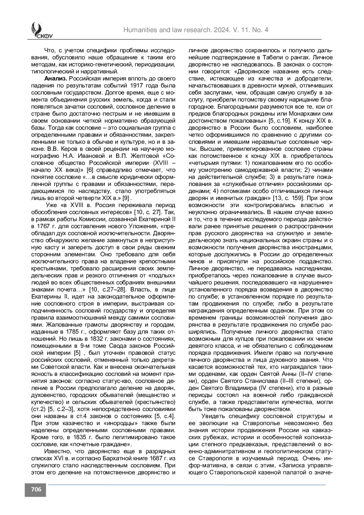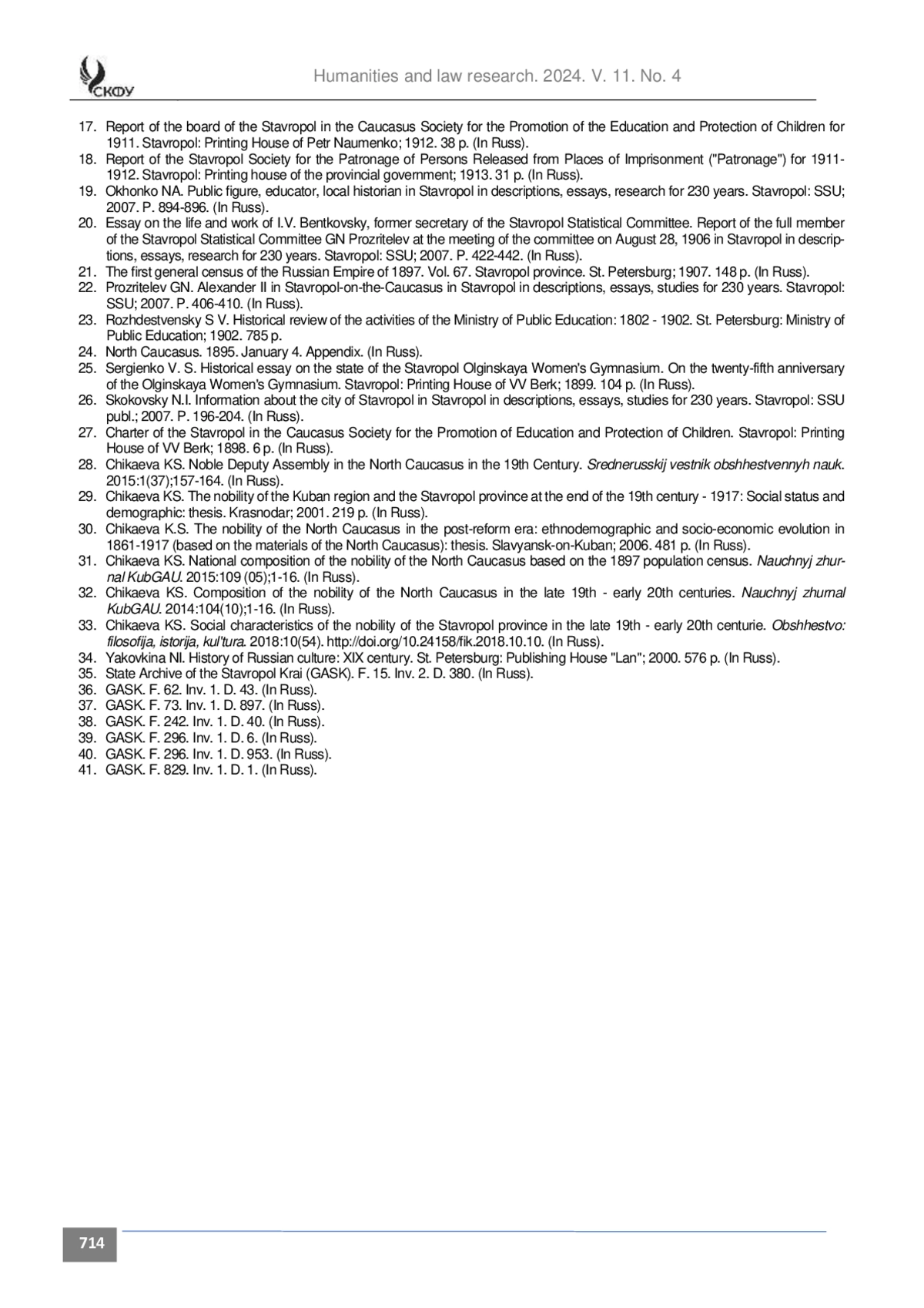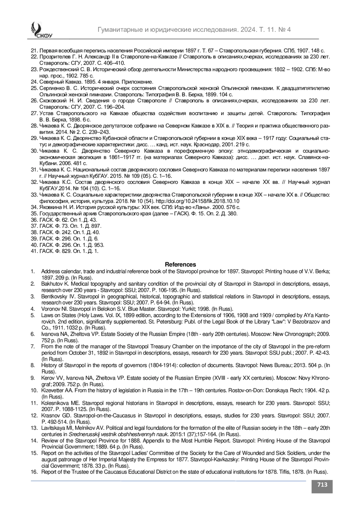 34. Чикаева К. С. Социальные характеристики дворянства Ставропольской губернии в конце XIX - начале XX в. // Общество: философия, история, культура. 2018. № 10 (54). https://doi.org/10.24158/fik.2018.10.10