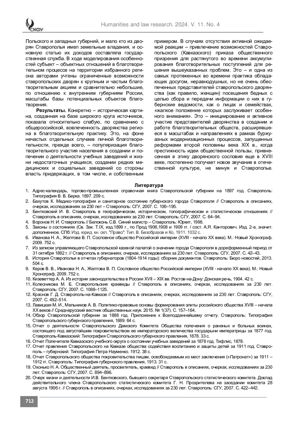 Введение. Статья посвящена исследованию проблемы участия дворян в благотворительном процессе на Ставрополье в XIX – начале XX вв. Отмечается, что содержание и особенности процесса становления и эволюции сословной структуры и оформления, в частности, дворянского сословия в изучаемом регионе, наряду с существовавшими нормативными рамками, закреплявшими его сословный статус, во-многом определялись спецификой продвижения России на кавказских рубежах, историей и особенностями колонизации степного предкавказья, особым военно-административным и геополитическим статусом Ставрополя в изучаемый период.