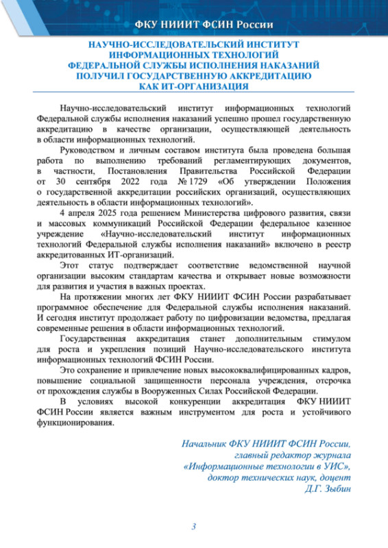 В статье рассмотрены вопросы, касающиеся создания единой информационной системы ФСИН России как одной из задач цифровой трансформации, обозначенных Концепцией развития уголовно-исполнительной системы Российской Федерации на период до 2030 года, утвержденной распоряжением Правительства Российской Федерации от 29.04.2021 No 1138-р. Раскрыты преимущества сквозной автоматизации основных процессов, осуществляемых ведомством, в отличие от так называемой лоскутной автоматизации деятельности, предполагающей создание отдельных, невзаимосвязанных сервисов и ресурсов под отдельные потребности. Обозначены принципы и способы создания ведомственной единой информационной системы. С учетом текущего состояния ведомственной ИТ-инфраструктуры предложен способ создания единой информационной системы в виде совокупности отдельных информационных систем как ее сервисов. Выделены и описаны основные этапы работы по созданию единой информационной системы ФСИН России на основе преобразования и доработки существующего ИТ-ландшафта. Подчеркнута важность централизованного управления всеми этапами разработки и внедрения единой информационной системы ФСИН России на основе перспективного планирования. Обоснована актуальность создания единой информационной системы и ее внедрения в деятельность УИС как основы цифровизации основных процессов ФСИН России, направленных на реализацию возложенных на ведомство функций и полномочий.