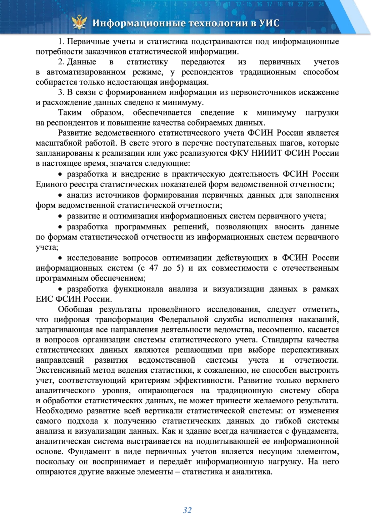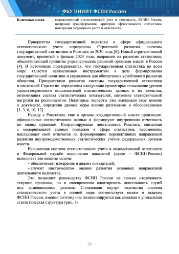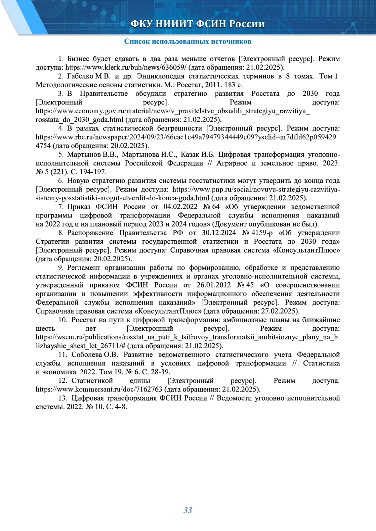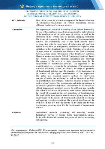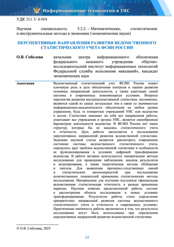 11. 	Соболева О.В. Развитие ведомственного статистического учета Федеральной службы исполнения наказаний в условиях цифровой трансформации // Статистика и экономика. 2022. Том 19. № 6. С. 28-39.  EDN: UKROZQ