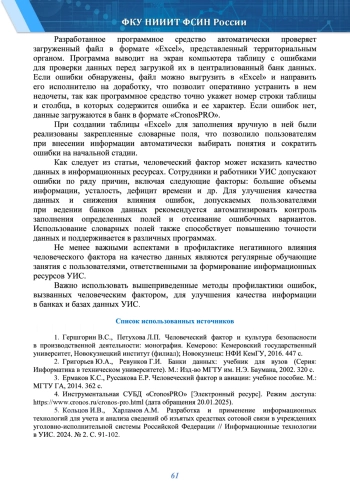 Статья посвящена анализу и оценке влияния человеческого фактора на качество формирования электронных банков данных в формате ИСУБД «CronosPRO». Рассмотрены такие понятия, как «человеческий фактор», «качество данных», «банк и база данных». Также в качестве примера приведены варианты некорректного заполнения различных сведений, предназначенных для формирования банка данных: опечатки, орфографические, пунктуационные и логические ошибки. Предложены способы решения данной проблемы. Кроме того, в статье в качестве примера приведено программное средство, в котором реализован алгоритм проверки сведений в формате «Excel», предназначенных для занесения в формируемый централизованный банк данных в формате ИСУБД «CronosPRO». Рассмотренное программное средство позволяет в автоматическом режиме определить наличие ошибок в таблице «Excel», планируемой к конвертированию в формат ИСУБД «CronosPRO», возможность вывести их на экран или выгрузить в файл. Внедрение рассмотренного программного средства позволило минимизировать количество ошибочных записей в ежемесячно формируемых централизованных банках данных путем проверки и исправления ошибок на стадии их формирования и, как следствие, минимизировать влияние человеческого фактора на качество данных в информационных ресурсах УИС.