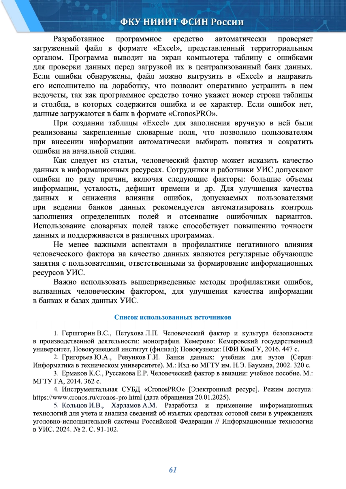 5. 	Кольцов И.В., Харламов А.М. Разработка и применение информационных технологий для учета и анализа сведений об изъятых средствах сотовой связи в учреждениях уголовно-исполнительной системы Российской Федерации // Информационные технологии в УИС. 2024. № 2. С. 91-102.  EDN: PBBGJS