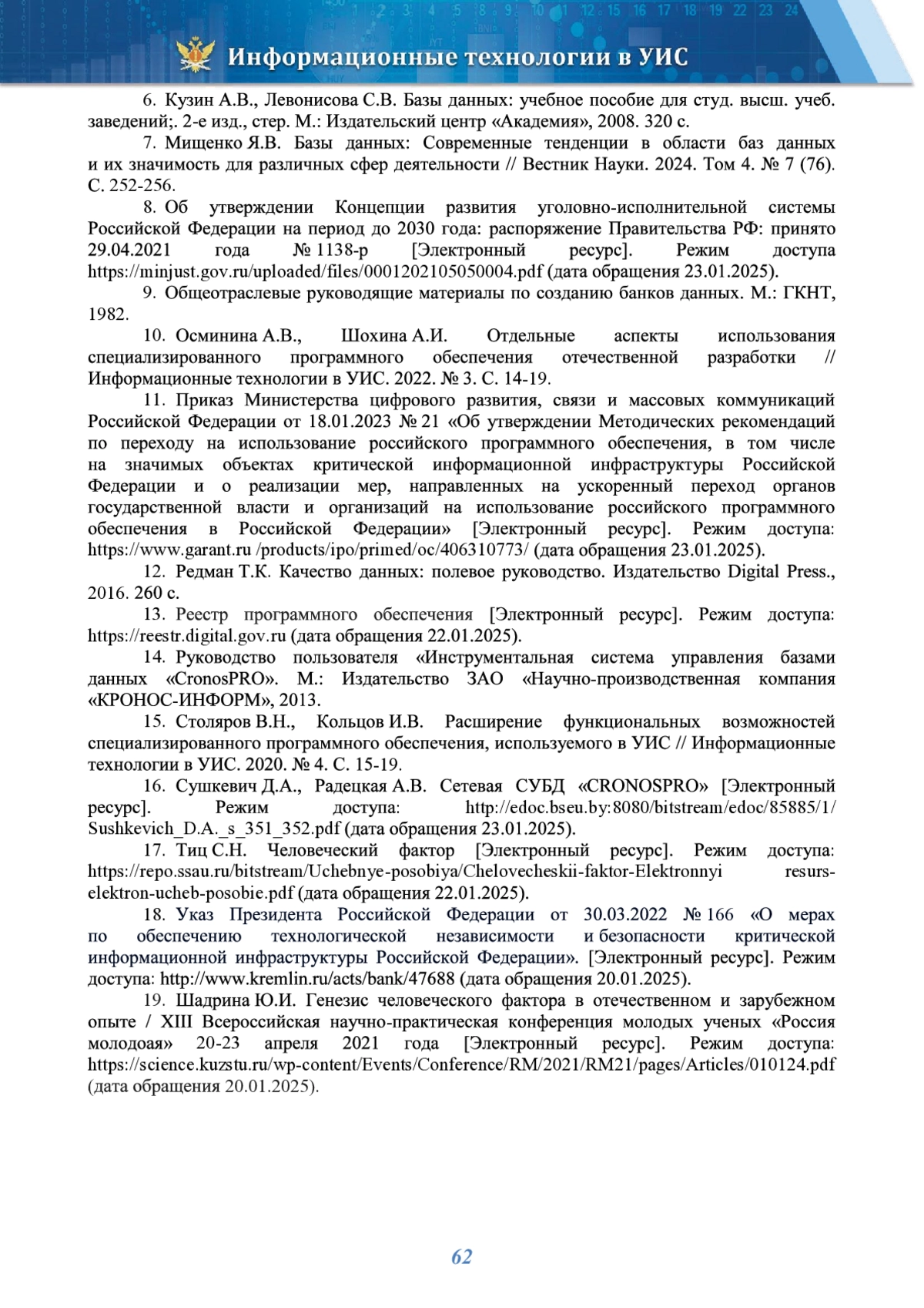 16. 	Сушкевич Д.А., Радецкая А.В. Сетевая СУБД “CRONOSPRO” [Электронный ресурс]. Режим доступа: http://edoc.bseu.by:8080/bitstream/edoc/85885/1/ Sushkevich_D.A._s_351_352.pdf (дата обращения 23.01.2025).