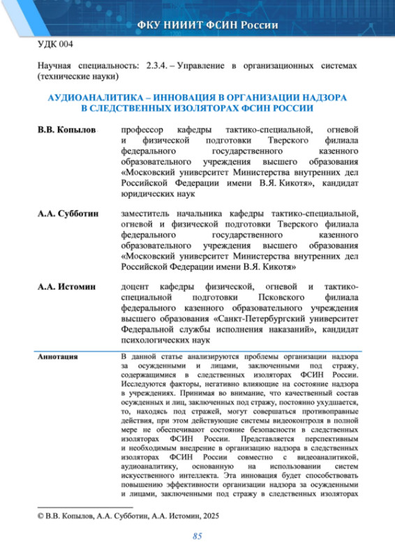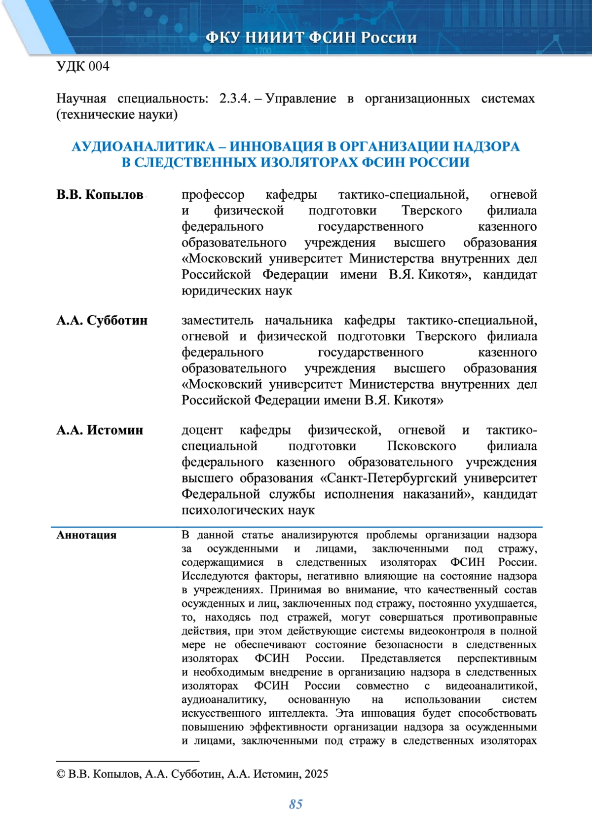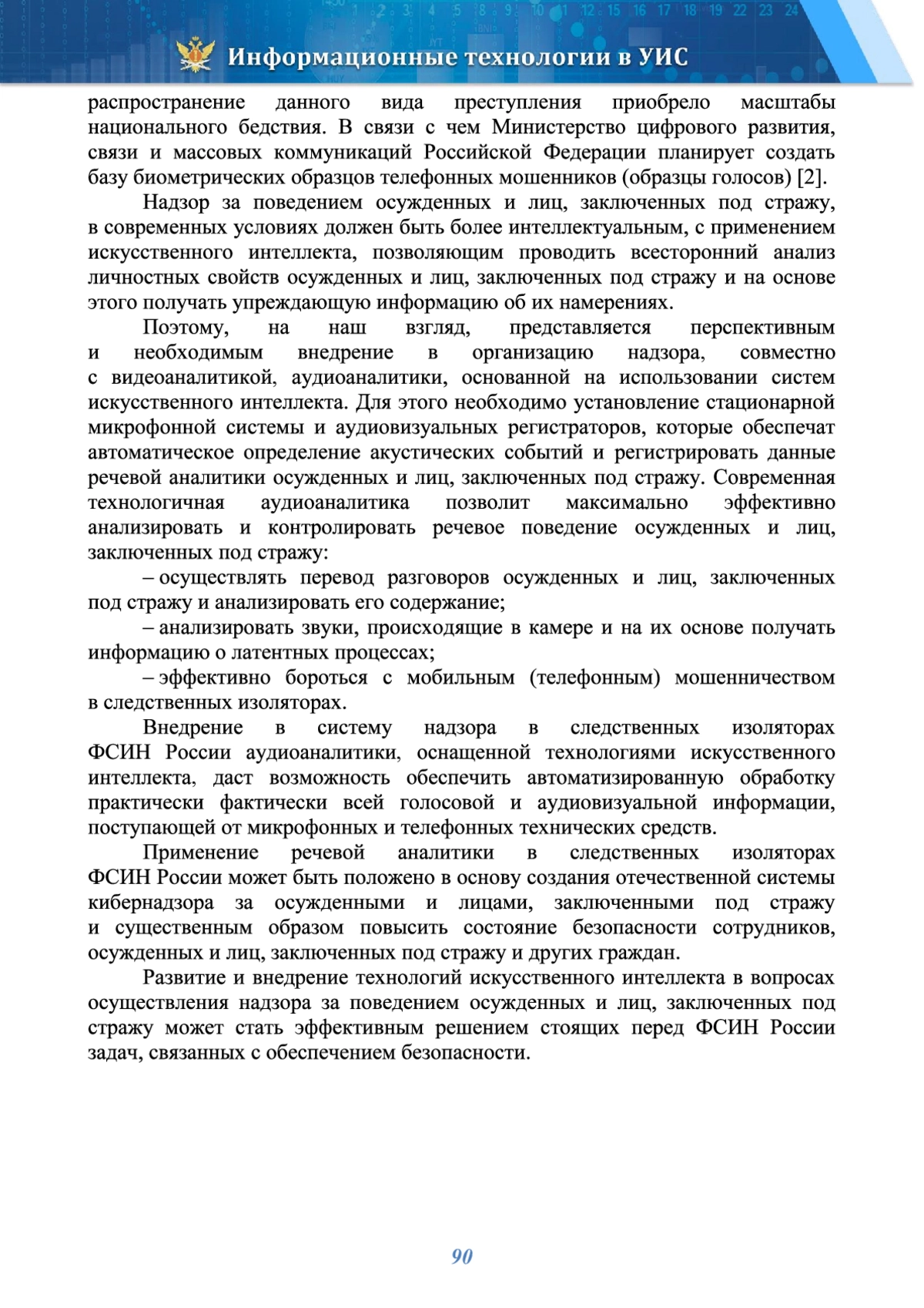 4. 	Любимов А.Е. О некоторых вопросах применения речевой аналитики с искусственным интеллектом в деятельности учреждений и органов уголовно-исполнительной системы / Информатизация и техническое обеспечение уголовно-исполнительной системы Российской Федерации: проблемы, решения и перспективы развития. Сборник материалов III Всероссийской научно-практической конференции, Тверь, 3-4 октября 2024 года. Тверь: ФКУ “Научно-исследовательский институт информационных технологий Федеральной службы исполнения наказаний”, 2024. С. 16-24.  EDN: HZWBUR