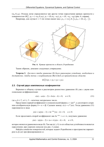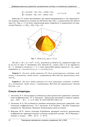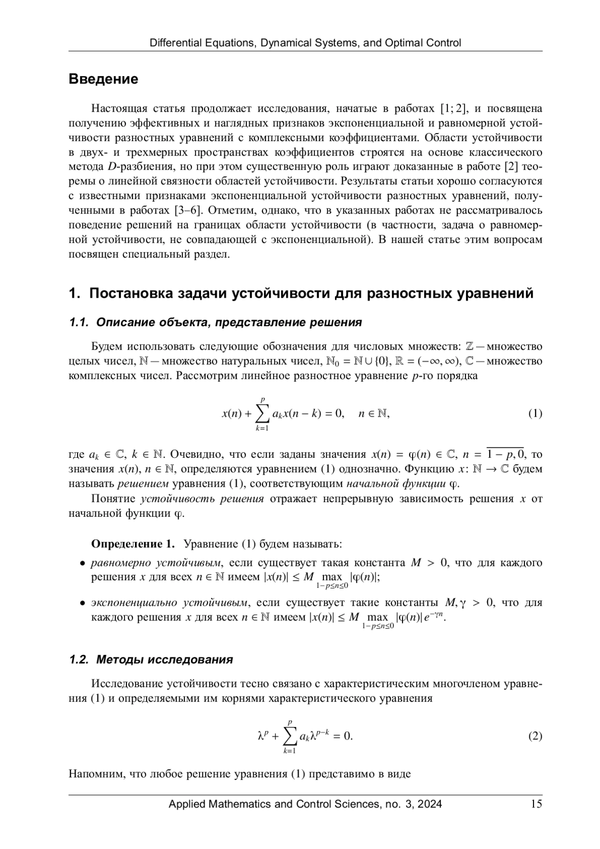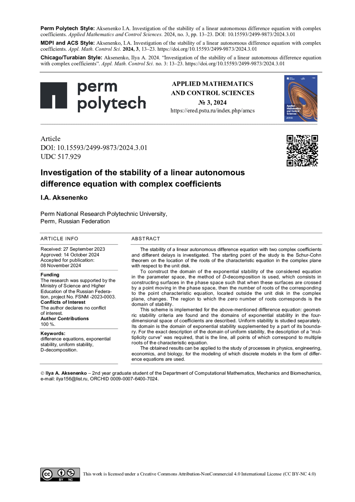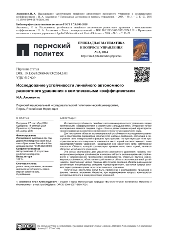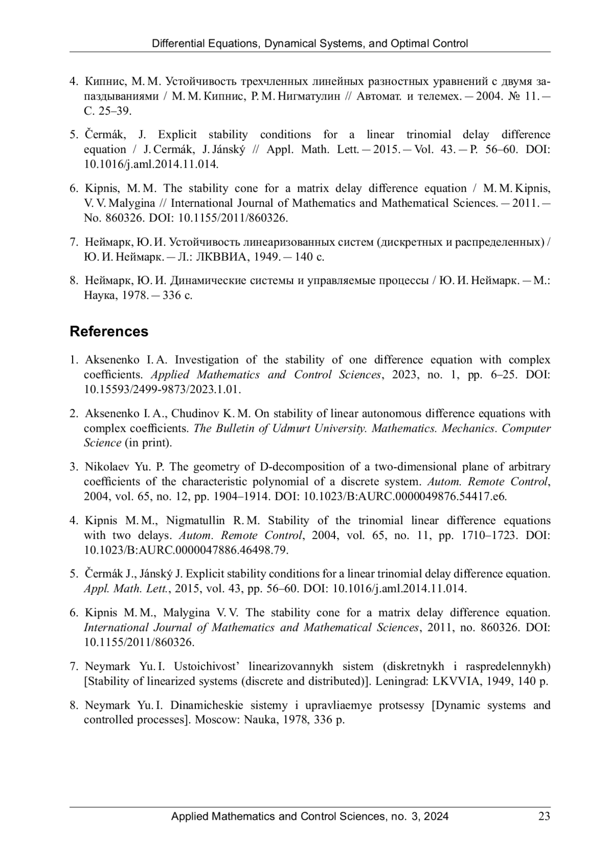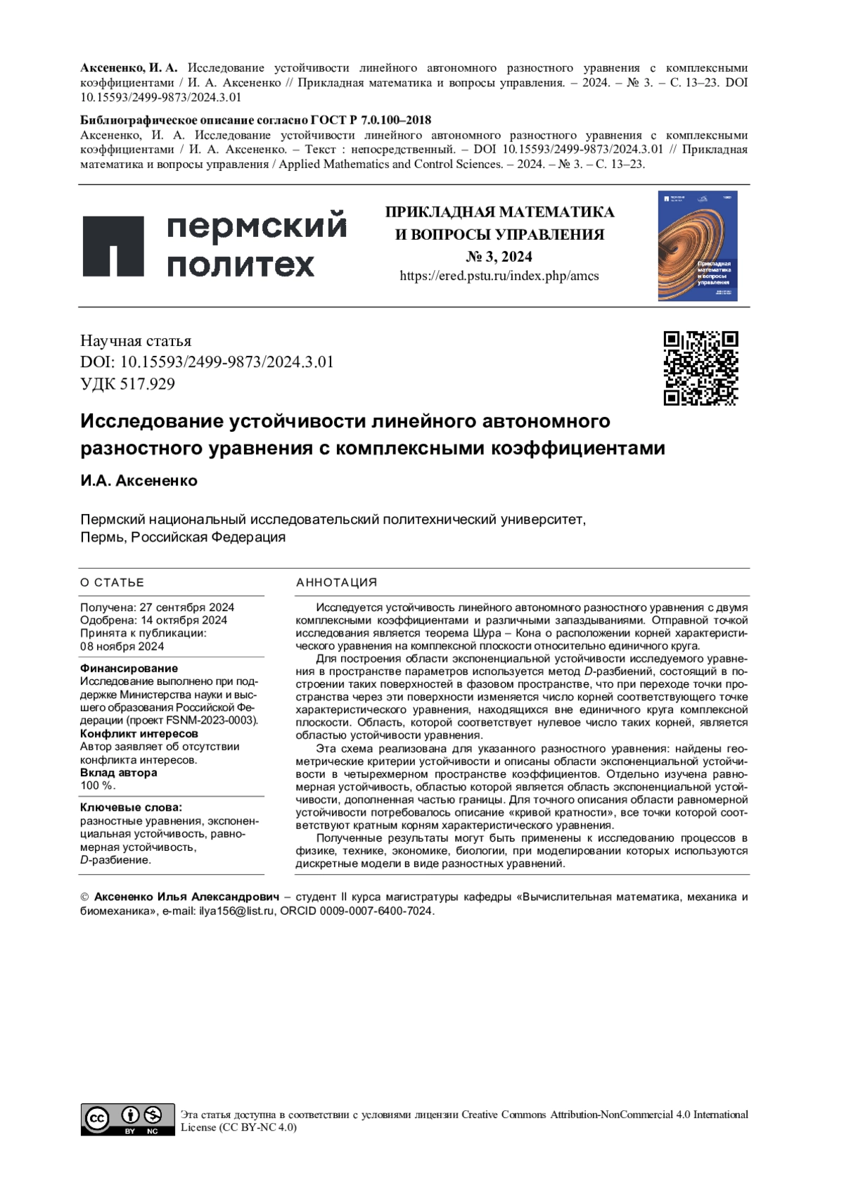 1. 	Аксененко, И. А. Исследование устойчивости одного разностного уравнения с комплексными коэффициентами / И. А. Аксененко // Прикладная математика и вопросы управления. - 2023. - № 1. - С. 6-25. DOI: 10.15593/2499-9873/2023.1.01 EDN: MVDEVM