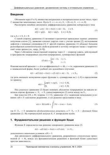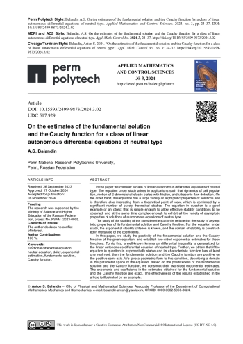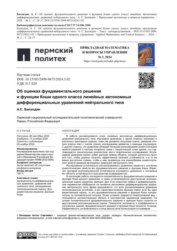 11. 	Баландин, А. С. О связи между фундаментальным решением и функцией Коши для функционально-дифференциальных уравнений нейтрального типа / А. С. Баландин // Прикладная математика и вопросы управления. - 2018. - № 1. - С. 13-25.  EDN: XMTBTV