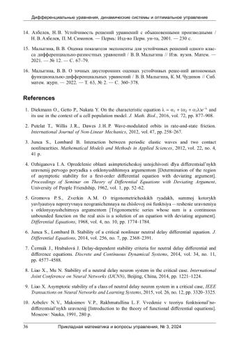 13. 	Баландин, А. С. Асимптотические свойства решений одного класса дифференциальных уравнений нейтрального типа / А. С. Баландин, В. В. Малыгина // Математические труды. - 2020. - Т. 23, № 2. - С. 3-49.  EDN: UQJRMP