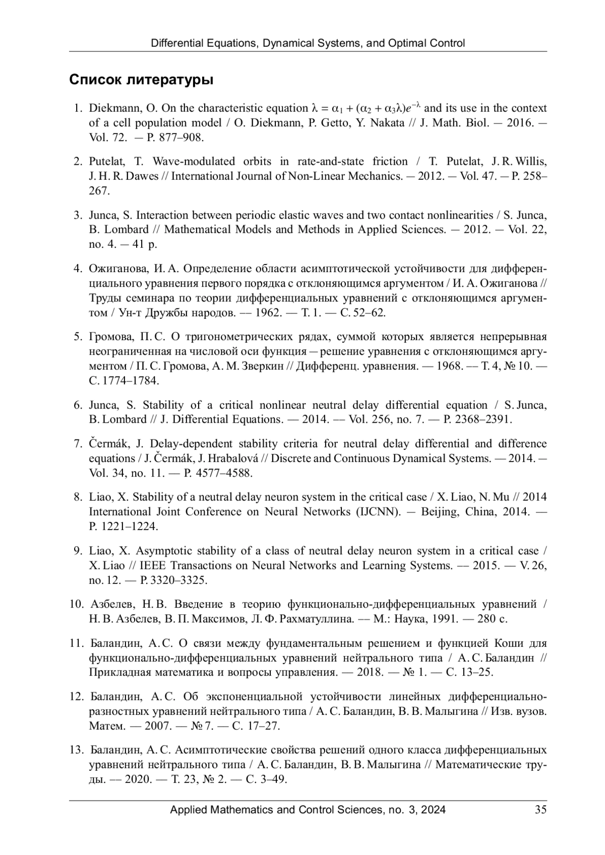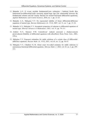12. 	Баландин, А. С. Об экспоненциальной устойчивости линейных дифференциально- разностных уравнений нейтрального типа / А. С. Баландин, В. В. Малыгина // Изв. вузов. Матем. - 2007. - № 7. - С. 17-27.  EDN: JKEEUH