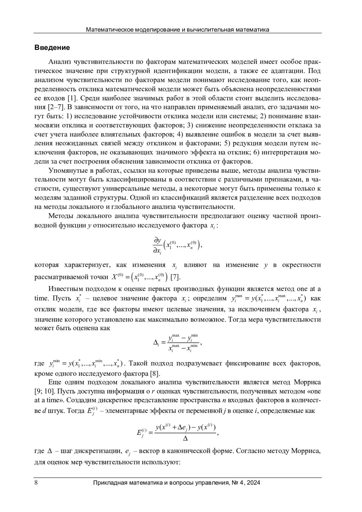 Анализ чувстивительности по факторам математических моделей имеет особое практическое значение при структурной идентификации модели, а также ее адаптации. Под анализом чувствительности по факторам модели понимают исследование того, как неопределенность отклика математической модели может быть объяснена неопределенностями ее входов [1]. Среди наиболее значимых работ в этой области стоит выделить исследования [2–7]. В зависимости от того, на что направлен применяемый анализ, его задачами могут быть: 1) исследование устойчивости отклика модели или системы; 2) понимание взаимосвязи отклика и соответствующих факторов; 3) снижение неопределенности отклака за счет учета наиболее влиятельных факторов; 4) выявление ошибок в модели за счет выявления неожиданных связей между откликом и факторами; 5) редукция модели путем исключения факторов, не оказывающих значимого эффекта на отклик; 6) интерпретация модели за счет построения обяснения зависимости отклика от факторов.
