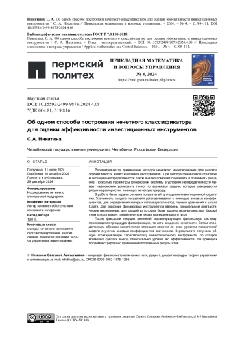 Рассматривается применение методов нечеткого моделирования для анализа эффективности инвестиционных инструментов. При выборе финансовой стратегии в ситуации неопределенности такой анализ помогает оценивать и принимать решение. Поскольку параметры финансовой системы в условиях неопределенности бывает невозможно установить точно, то возникают задачи, которые описываются рядом характеристик, имеющих нечеткую природу. В работе была задана система показателей для оценки инвестиционной стратегии. Значимость каждого показателя устанавливается с помощью весовых коэффициентов, для определения которых используется метод парных сравнений и шкала Саати. Для описания финансовых инструментов введены специальные лингвистические переменные, для каждой из которых были заданы терм-множества. Каждый терм представляет собой нечеткое число трапециевидного типа. После фиксации текущих значений, характеризующих финансовую систему, производится процедура фаззификации, то есть введения нечеткости. Затем определенным образом выполняется операция свертки по всем уровням показателей модели с учетом весовых коэффициентов значимости. В результате получаем общую агрегированную характеристику инвестиционного инструмента, по которой возможно сделать вывод относительно уровня его эффективности. На примерах продемонстрировано применение полученных результатов
