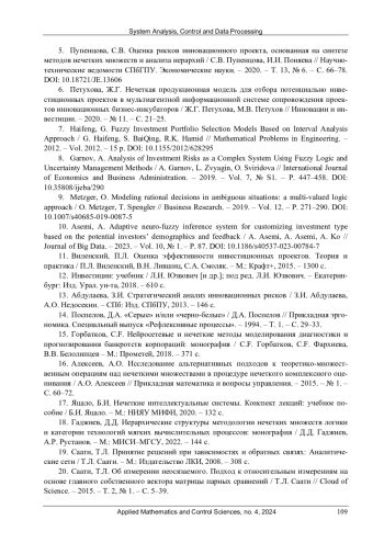 6. Петухова, Ж.Г. Нечеткая продукционная модель для отбора потенциально инвестиционных проектов в мультиагентной информационной системе сопровождения проектов инновационных бизнес-инкубаторов / Ж.Г. Петухова, М.В. Петухов // Инновации и инвестиции. - 2020. - № 11. - С. 21-25. EDN: RUWDCM