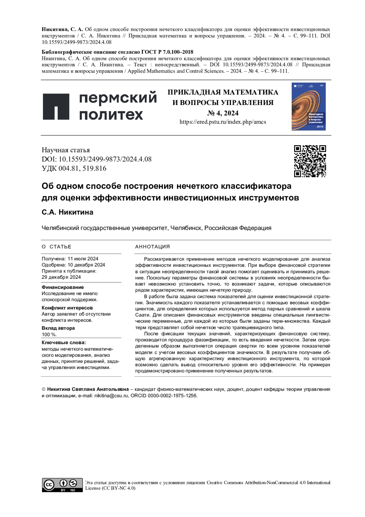 3. Использование теории нечетких множеств в экономическом анализе инвестиционных проектов / Р.А. Файзиев, У.Т. Хаитматов, О.Х. Азаматов, Ш.Р. Джуманиязов, Х.Х. Хасанова / International Journal of Innovative Technologies in Economy. - 2018. - Т. 2, № 5(17). - С. 44-48. DOI: 10.31435/rsglobal_ijite/01062018/5672 EDN: OUGRGL
