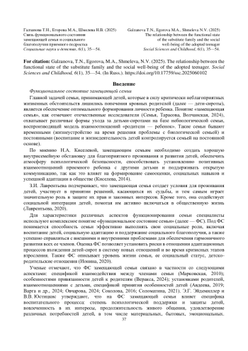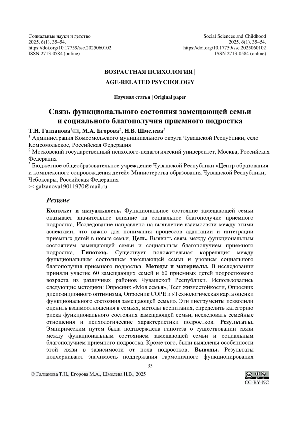 Контекст и актуальность. Функциональное состояние замещающей семьи оказывает значительное влияние на социальное благополучие приемного подростка. Исследование направлено на выявление взаимосвязи между этими аспектами, что важно для понимания процессов адаптации и интеграции приемных детей в новые семьи. Цель. Выявить связь между функциональным состоянием замещающей семьи и социальным благополучием приемного подростка. Гипотеза. Существует положительная корреляция между функциональным состоянием замещающей семьи и уровнем социального благополучия приемного подростка. Методы и материалы. В исследовании приняли участие 60 замещающих семей и 60 приемных детей подросткового возраста из различных районов Чувашской Республики. Использовались следующие методики: Опросник «Моя семья», Тест жизнестойкости, Опросник диспозиционного оптимизма, Опросник СОРЕ и «Технологическая карта оценки функционального состояния замещающей семьи». Эти инструменты позволили оценить взаимоотношения в семьях, методы воспитания, определить категорию риска функционального состояния замещающей семьи, исследовать семейные отношения и психологические характеристики подростков. Результаты. Эмпирическим путем была подтверждена гипотеза о существовании связи между функциональным состоянием замещающей семьи и социальным благополучием приемного подростка. Кроме того, были выявлены особенности этой связи в зависимости от пола подростков. Выводы. Результаты подчеркивают значимость поддержания гармоничного функционирования замещающих семей для обеспечения социального благополучия их воспитанников.