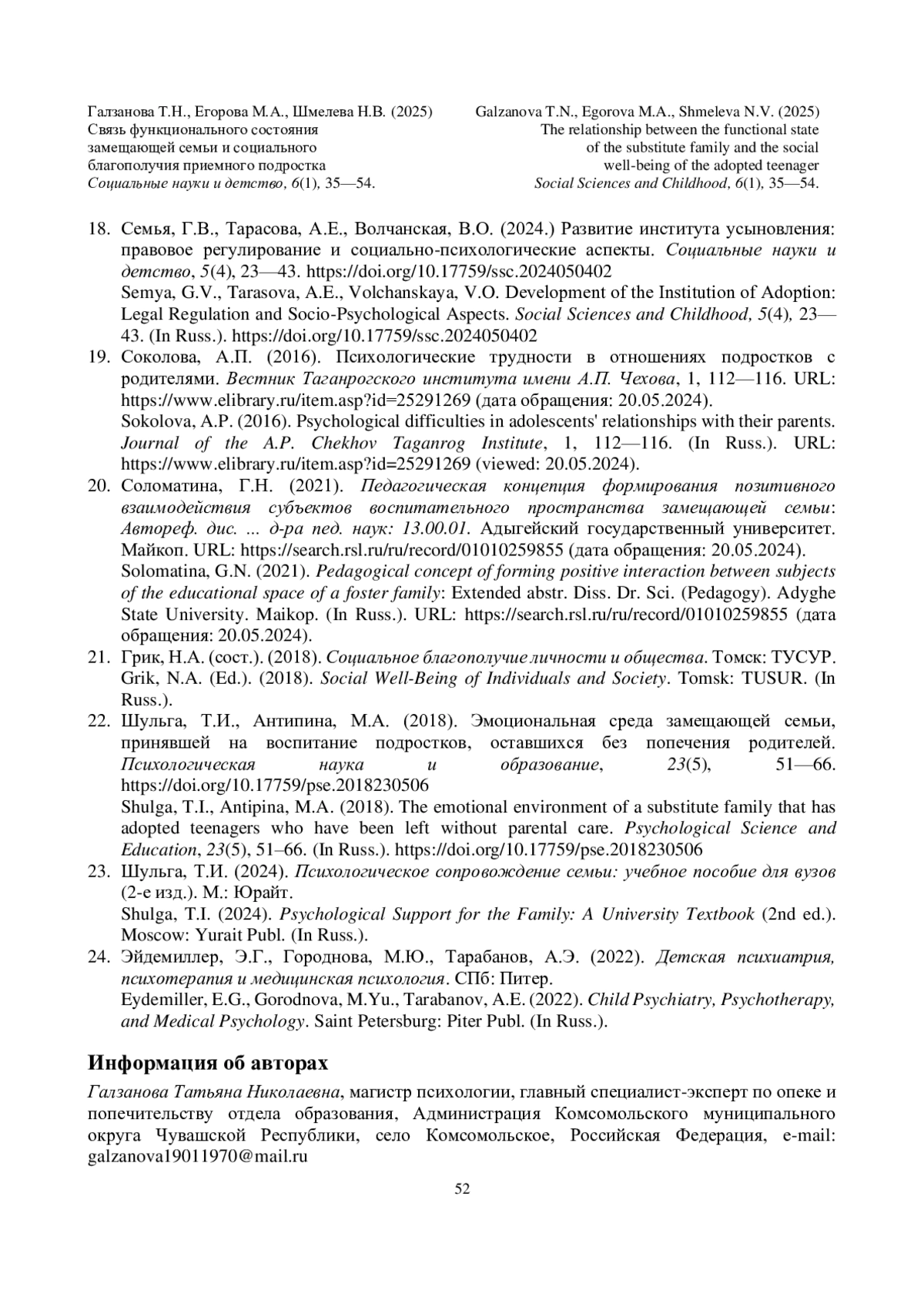 22. Шульга, Т.И., Антипина, М.А. (2018). Эмоциональная среда замещающей семьи, принявшей на воспитание подростков, оставшихся без попечения родителей. Психологическая наука и образование, 23(5), 51-66. DOI: 10.17759/pse.2018230506