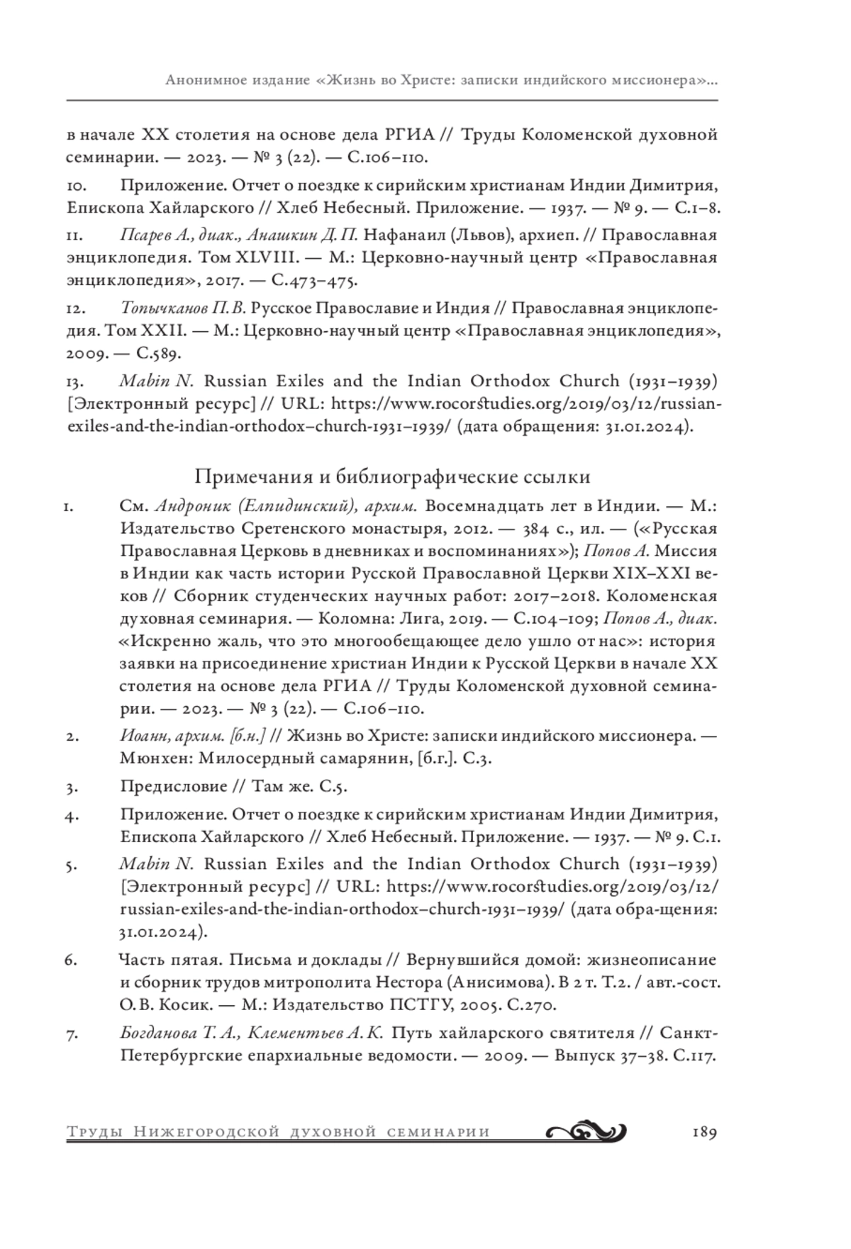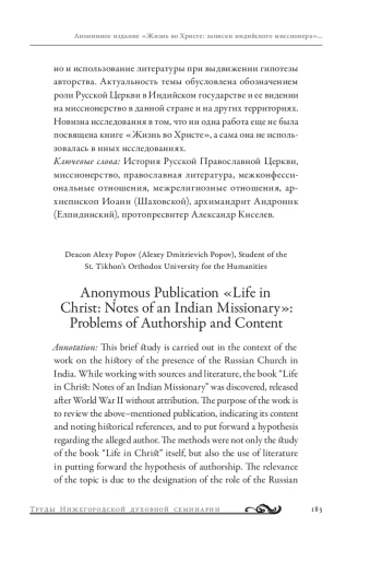 Попов А.Д., диак. Анонимное издание “Жизнь во Христе: записки индийского миссионера”: проблемы авторства и содержания // Труды Нижегородской духовной семинарии. - 2024. - №1 (16). - С.96-116.
