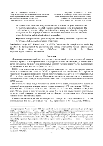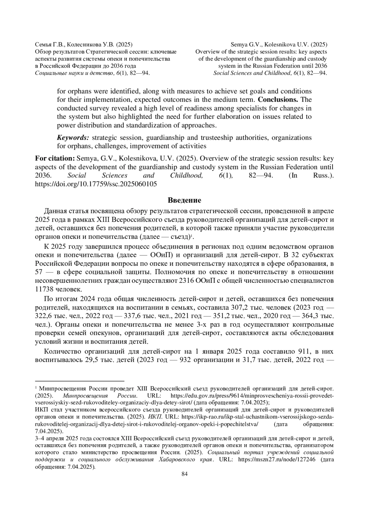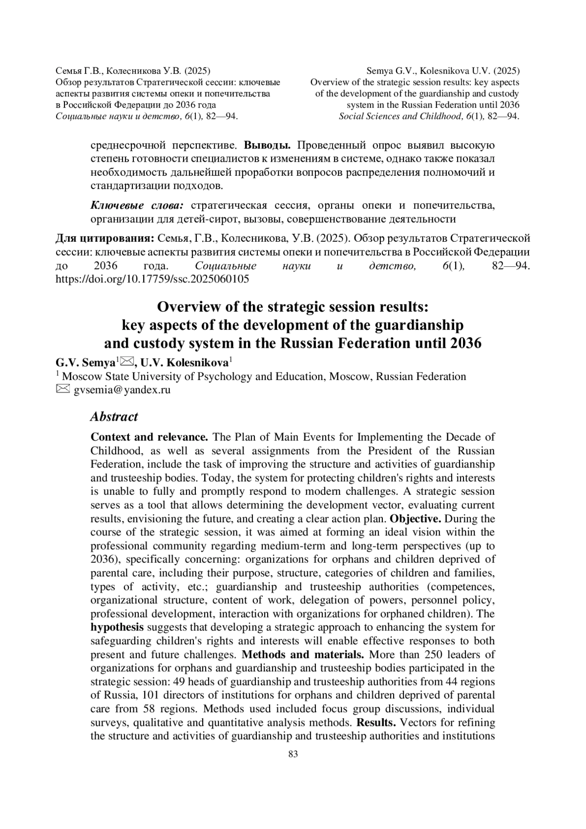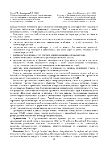 Контекст и актуальность. План основных мероприятий по реализации Десятилетия детства, ряд поручений Президента Российской Федерации содержат задачу совершенствования структуры и деятельности органов опеки и попечительства. Сегодня система защиты прав и интересов детей не в состоянии полноценно и своевременно ответить на современные вызовы. Инструментом, позволяющим определить вектор развития, оценить текущие результаты, представить будущее и создать четкий план действий, является стратегическая сессия. Цель. В ходе проведения стратегической сессии сформировать в профессиональном сообществе идеальное видение в среднесрочной и дальнесрочной (2036 год) перспективе: организаций для детей-сирот и детей, оставшихся без попечения родителей, включая назначение, структуру, категории детей и семей, виды деятельности и пр.; органов опеки и попечительства (полномочия, организационная структура, содержание работы, передача полномочий, кадровая политика, профессиональное развитие, взаимодействие с организациями для детей-сирот). Гипотеза заключается в том, что разработка стратегического подхода к развитию системы защиты прав и интересов детей позволит эффективно ответить на текущие и будущие вызовы. Методы и материалы. В стратегической сессии приняли участие более 250 руководителей организаций для детей-сирот и органов опеки и попечительства: 49 руководителей органов опеки и попечительства из 44 субъектов России, 101 руководитель организаций для детей-сирот и детей, оставшихся без попечения родителей, из 58 субъектов. Были использованы: метод фокус-групп, индивидуальный опрос, качественные и количественные методы анализа. Результаты. Определены векторы совершенствования структуры и деятельности ООиП и организаций для детей-сирот, меры достижения поставленных целей и условия их реализации, ожидаемые результаты в среднесрочной перспективе. Выводы. Проведенный опрос выявил высокую степень готовности специалистов к изменениям в системе, однако также показал необходимость дальнейшей проработки вопросов распределения полномочий и стандартизации подходов.